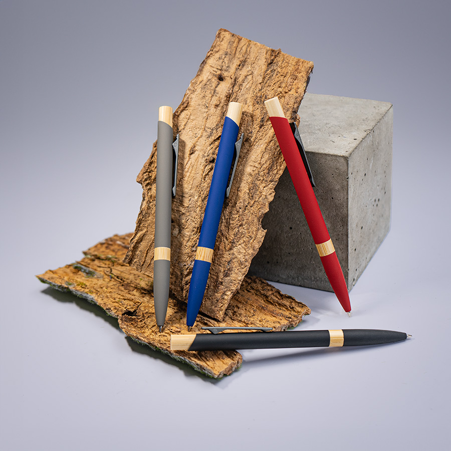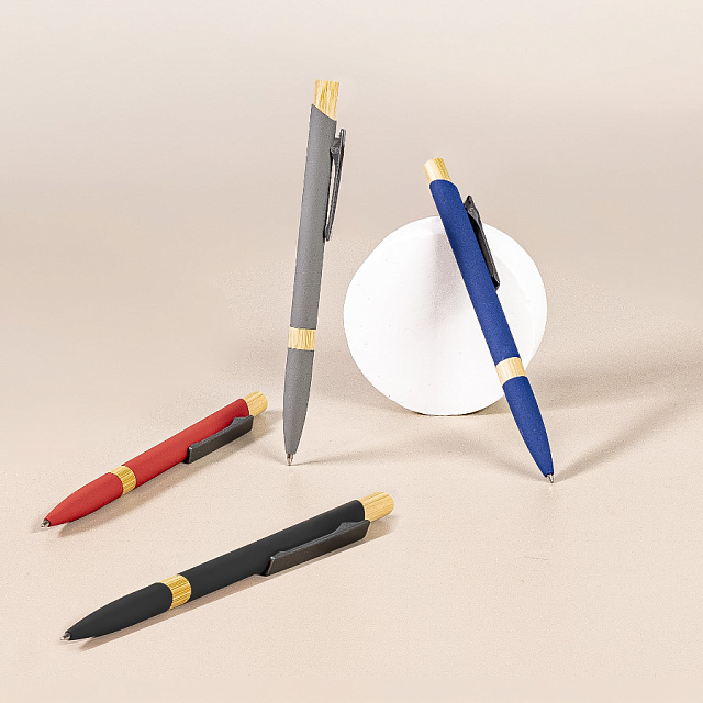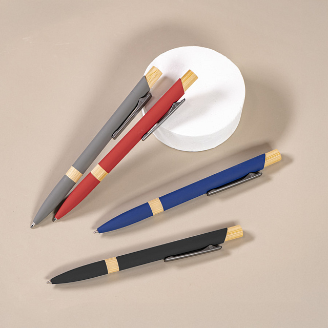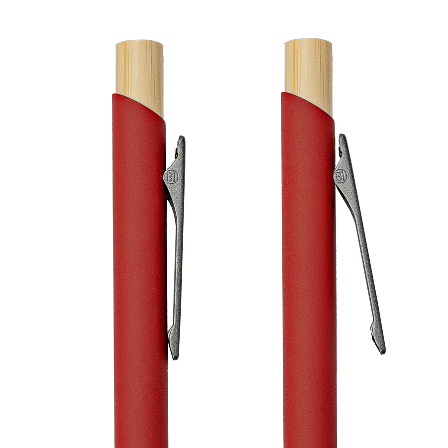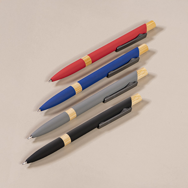 Экстравагантная модель ручки FRESCO. Корпус алюминиевый с матовым покрытием soft touch - ручку приятно держать в руке. Металлический клип-прищепка является эксклюзивом бренда В1. Отделка из натурального бамбука добавляет модели оригинальность. Кнопка нажимного механизма оптимального диаметра удобна для подушечки пальца. Визуально ручка выглядит очень благородно. В использовании гарантированно комфортна. • Цвет, близкий к Pantone 200C• Размер φ 10 x 140 мм• Корпус из алюминия с покрытием soft touch• Металлический клип-прищепка• Отделка - бамбук• Нажимной механизм подачи стержня• Пулевидный пишущий узел 1.0 мм• Длина линии письма 800-1000 м• Чернила Dokumental, цвет чернил синий• Сменный стержень Parker type• Виды нанесения: гравировка