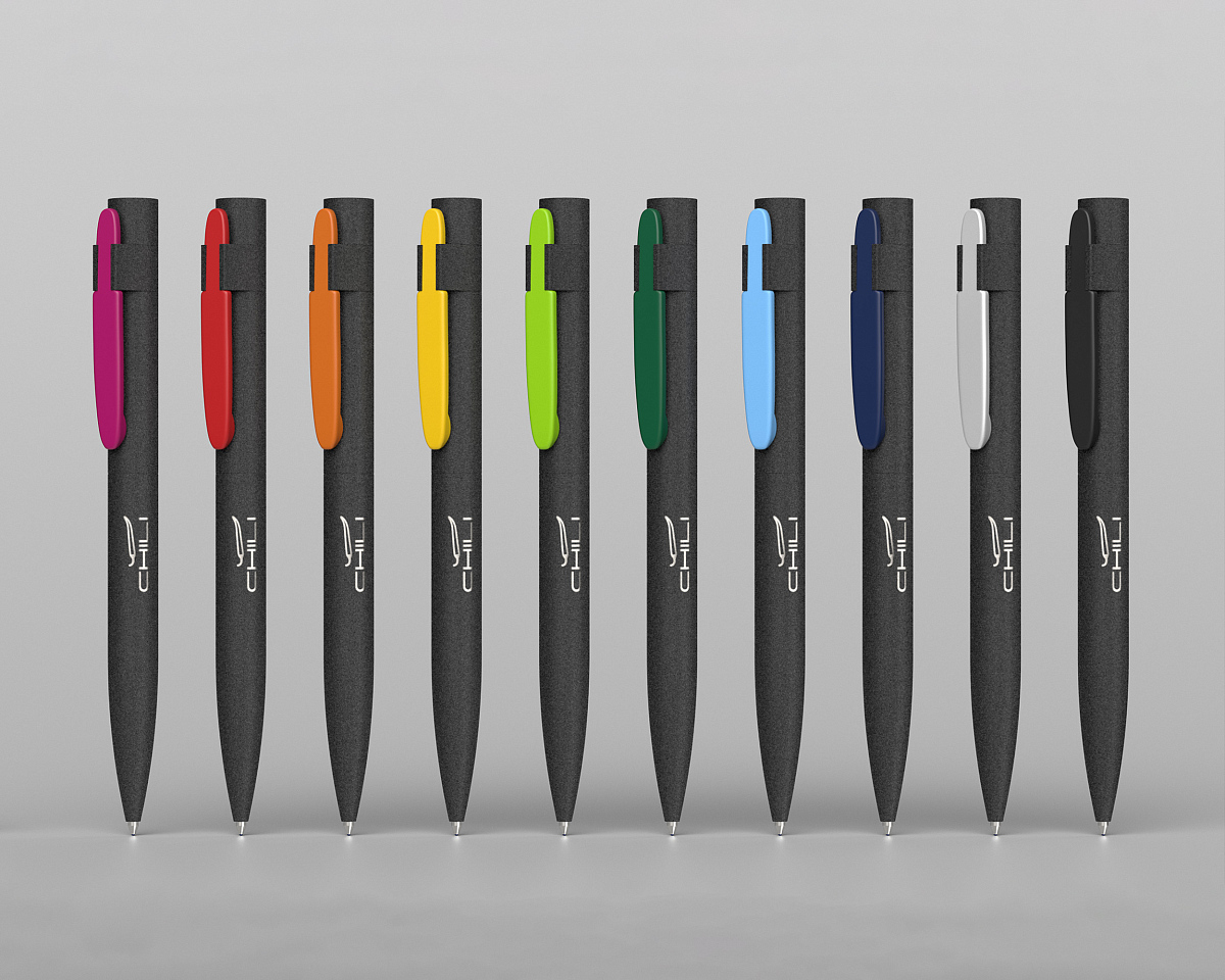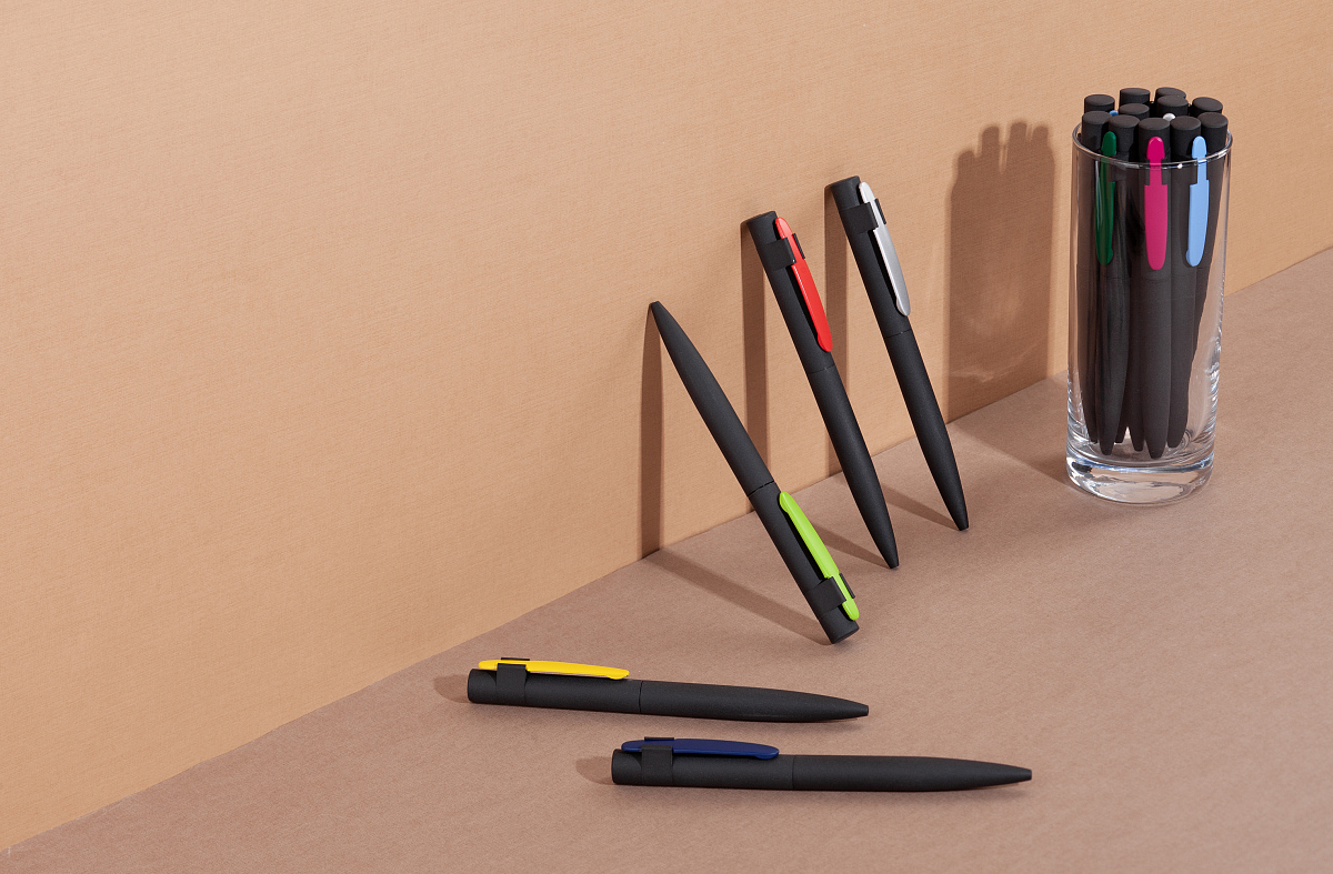 Оригинальное сочетание черного корпуса ручки в покрытии SOFTGRIP, обеспечивающем лёгкий массажный эффект, c цветным металлическим матовым клипом.