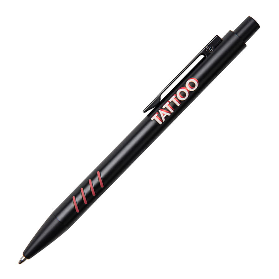 Цветные грип-вставки, контрастирующие с полностью черным корпусом - не единственная особенность TATTOO. На этой ручке возможна двухцветная 3D-гравировка. Зеркальная подложка в цвет прорезиненных вставок в сочетании с белым матовым покрытием позволяют получить эффект объема при нанесении логотипа или рекламного сообщения. Pantone, близкий к 298C.