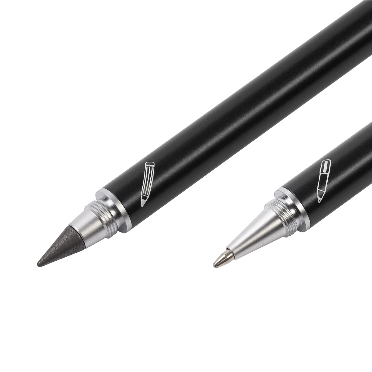 Набор из 2х письменных принадлежностей в едином корпусе - шариковой ручки и вечного карандаша, грифель которого выполнен из сверхпрочного графита с длиной письма до 30 000 метров, Закручивающиеся колпачки надёжно сохраняют пишущие узлы от внешних воздействий.