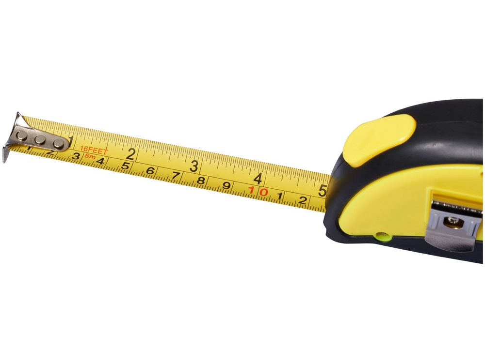 Рулетка 5м. Рулетка 5м с клипом для ремня, стропой и функцией автоблокировки. Шкала измерения в сантиметрах и футах. Упакована в коробку STAC. АБС и ТПР.