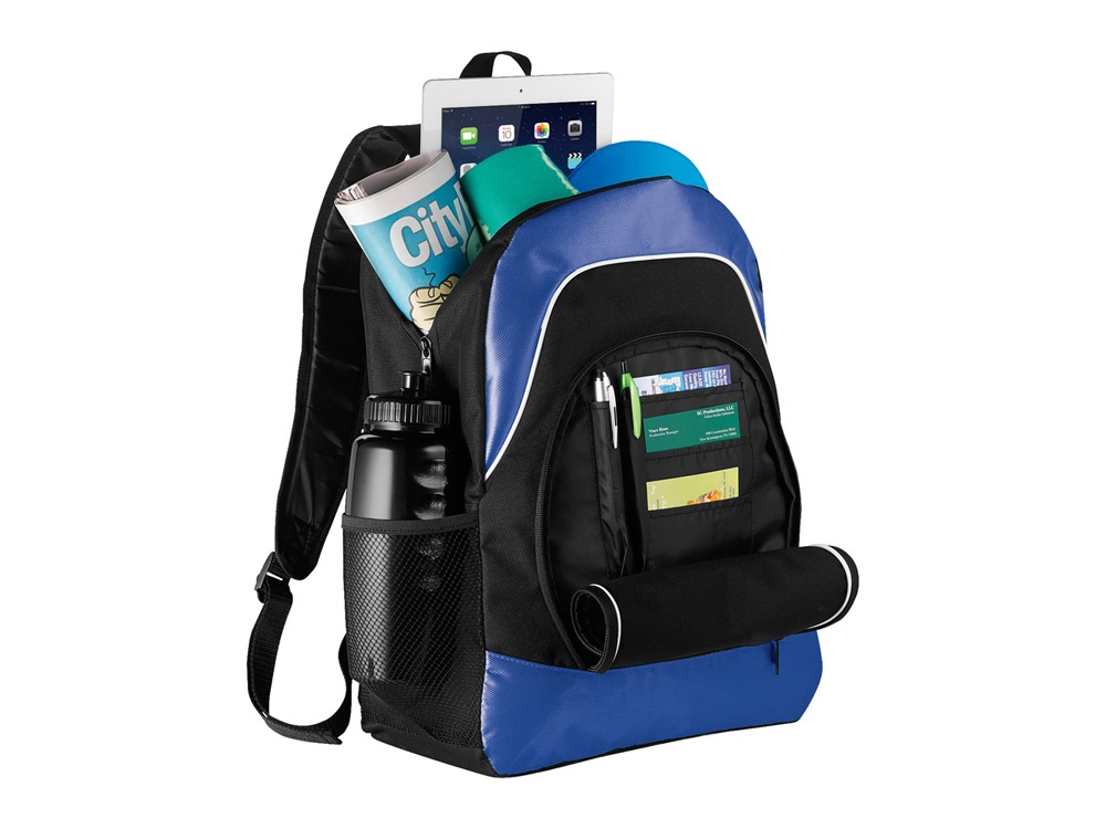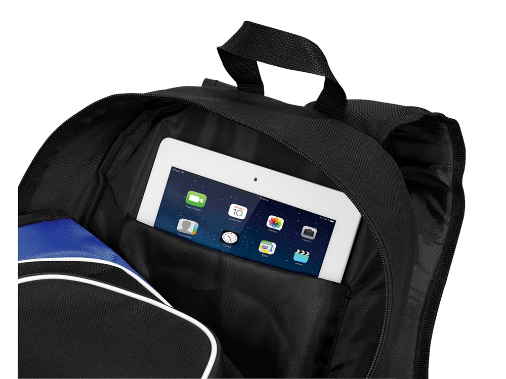 Рюкзак для планшета Branson. Основное отделение на молнии с карманом с мягкой подкладкой для iPads, планшетов и eReader. Передний карман на молнии с панелью-органайзером. Боковой сетчатый карман. Спинка с мягкой подкладкой. Регулируемые плечевые ремни с мягкими подкладками. Усиленная ручка. Планшет не включен.