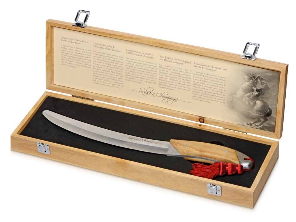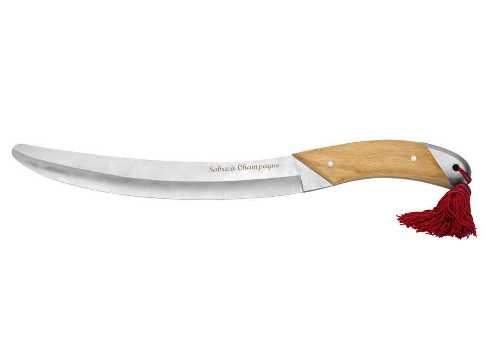 Сабраж — это необычный и очень зрелищный способ открывания шампанского, при котором горлышко бутылки не откупоривается, а сбивается вместе с пробкой. Сабля для сабража от Pulltex, испанского производителя аксессуаров для вина, создана специально для этой цели с учетом всех особенностей процесса: удобная ручка, плоское лезвие, изогнутое специально под горлышко. Рукоять выполнена из дерева, благодаря чему обеспечивается удобный хват, а кисть бордового цвета и нарядный деревянный футляр дополняют саблю, придавая ее облику торжественность.
