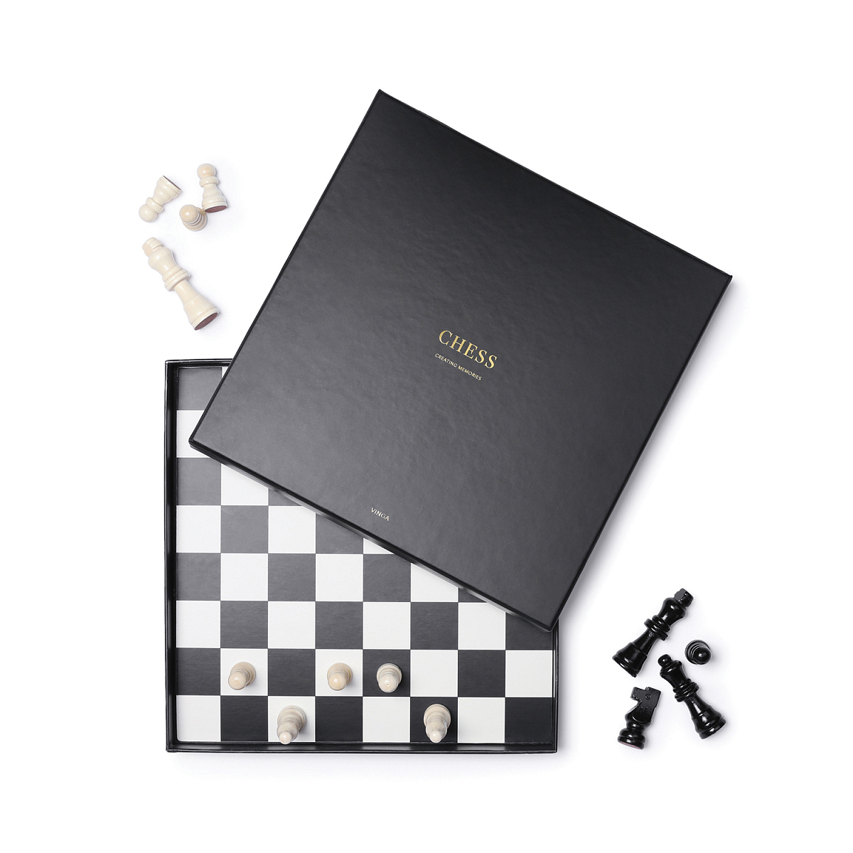 Провести вечер за настольными играми можно с набором для шахмат от VINGA. Это классический черно-белый набор с фигурками из лакированного дерева. В комплект входит мешочек для фигурок.
