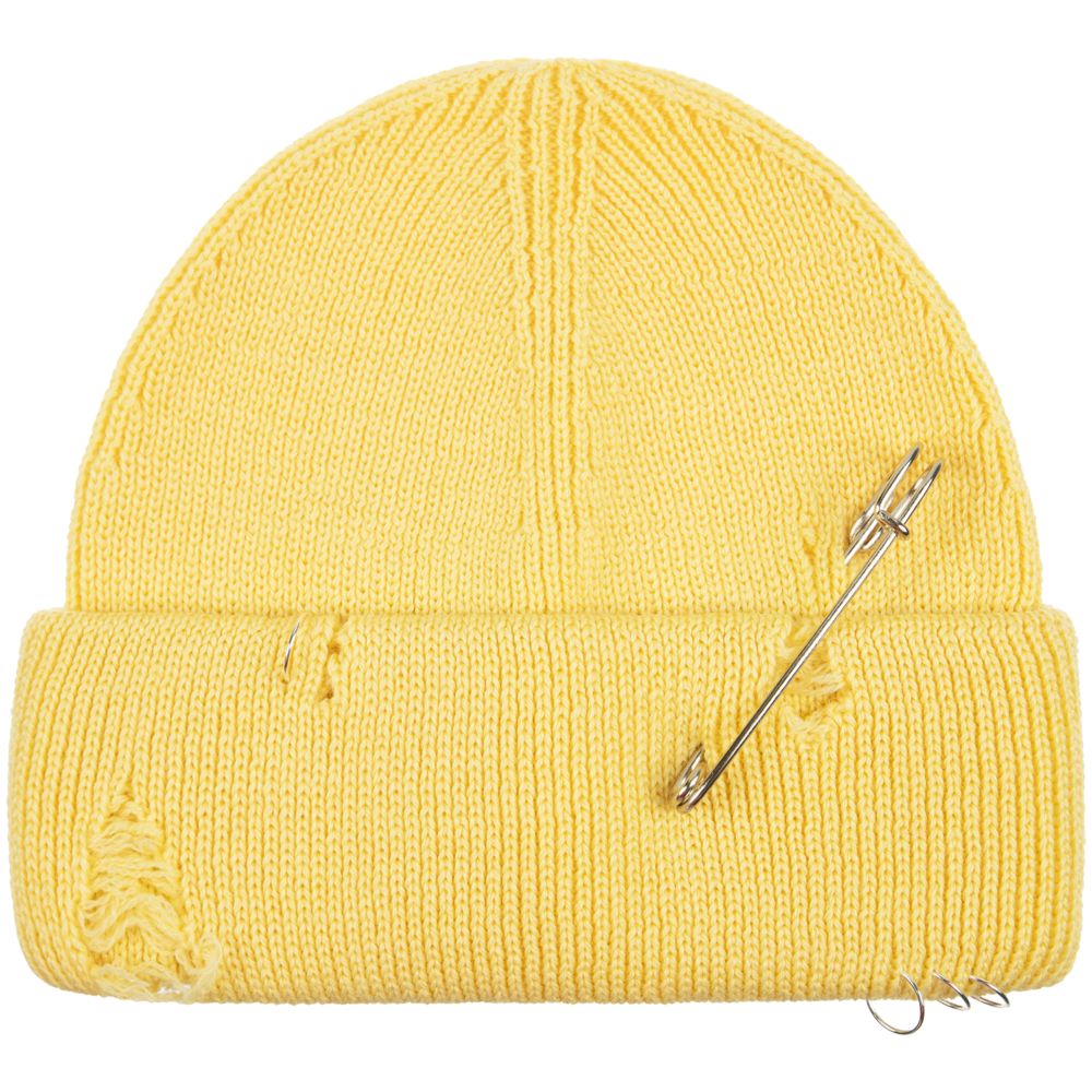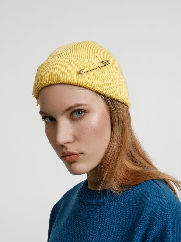 Однослойная шапка бини с рваным отворотом и металлическими аксессуарами для дерзких образов в любом возрасте. Яркий и запоминающийся акцент в стиле гранж.
