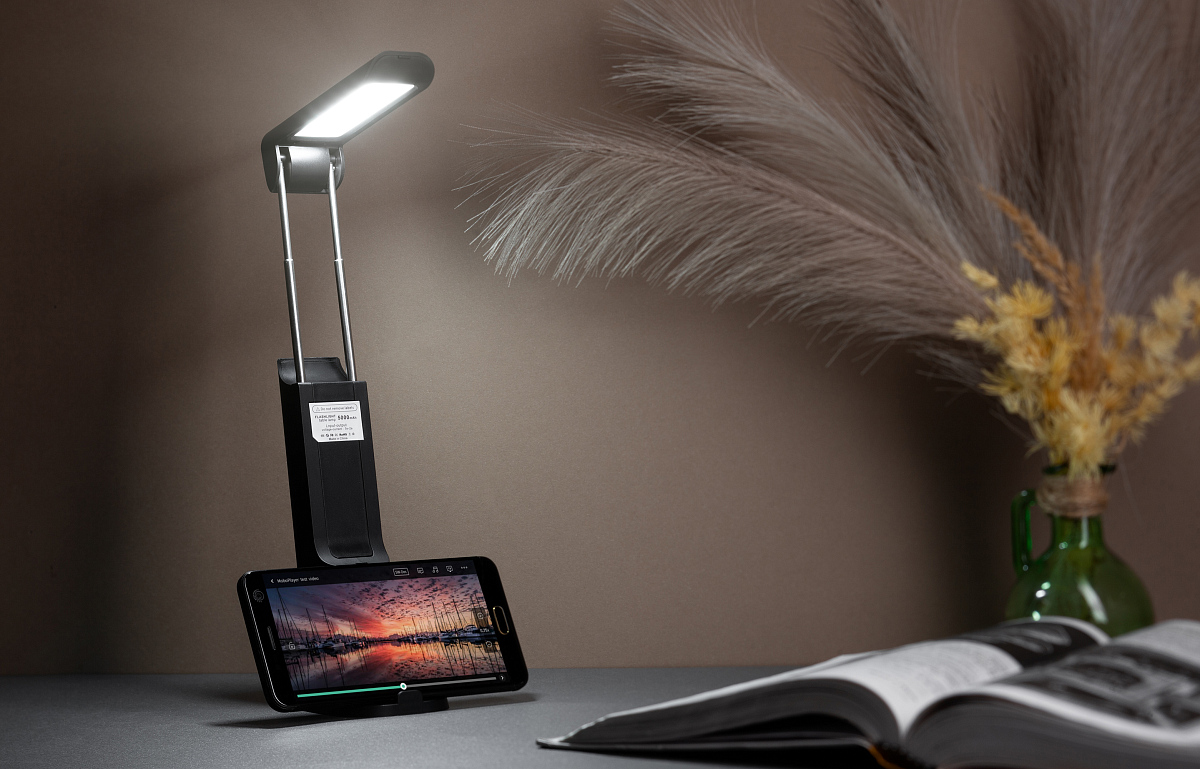 Благодаря подставке лампу удобно установить на горизонтальной поверхности, предусмотрен фиксатор для смартфона. 3 положения основания позволяют задать желаемый наклон экрана и использовать смартфон как в горизонтальном так и в вертикальном положении. Телескопические направляющие увеличивают высоту лампы на 10 см, регулировка наклона до 90º для настройки светового потока.