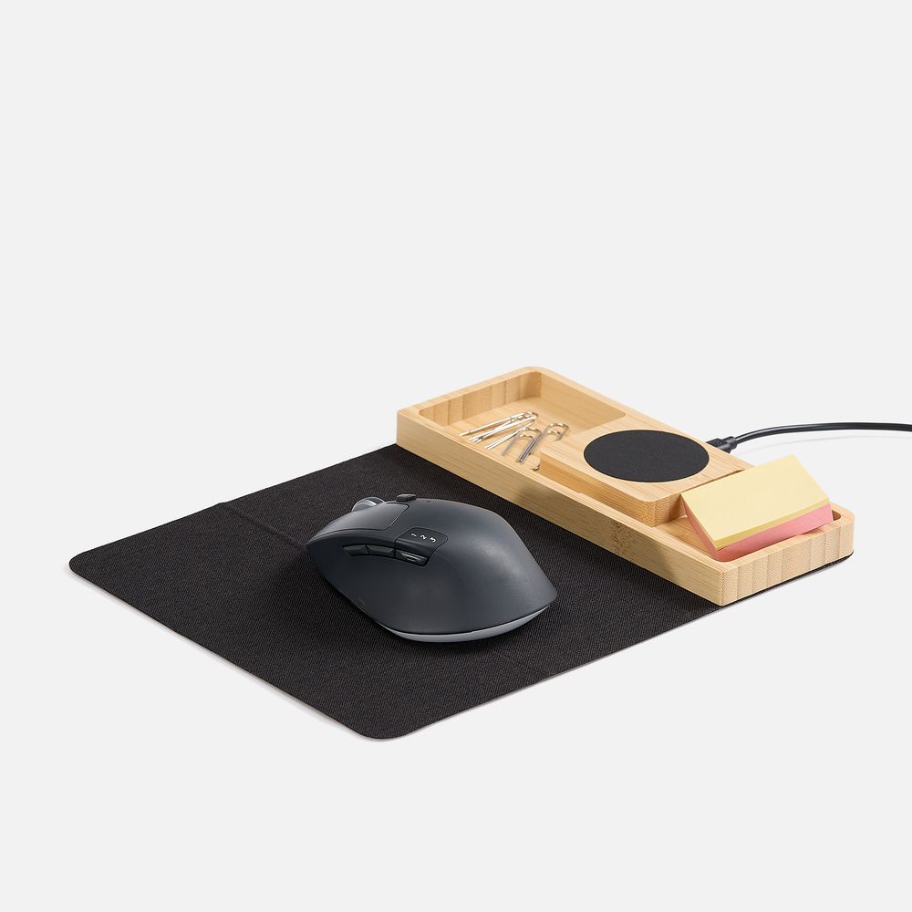 Midstream — это коврик для мышки с площадкой для беспроводной зарядки и отсеком для канцелярских принадлежностей. Его можно использовать как на работе, так и в дороге или на встречах: коврик компактно складывается и не занимает много места в сумке для ноутбука.