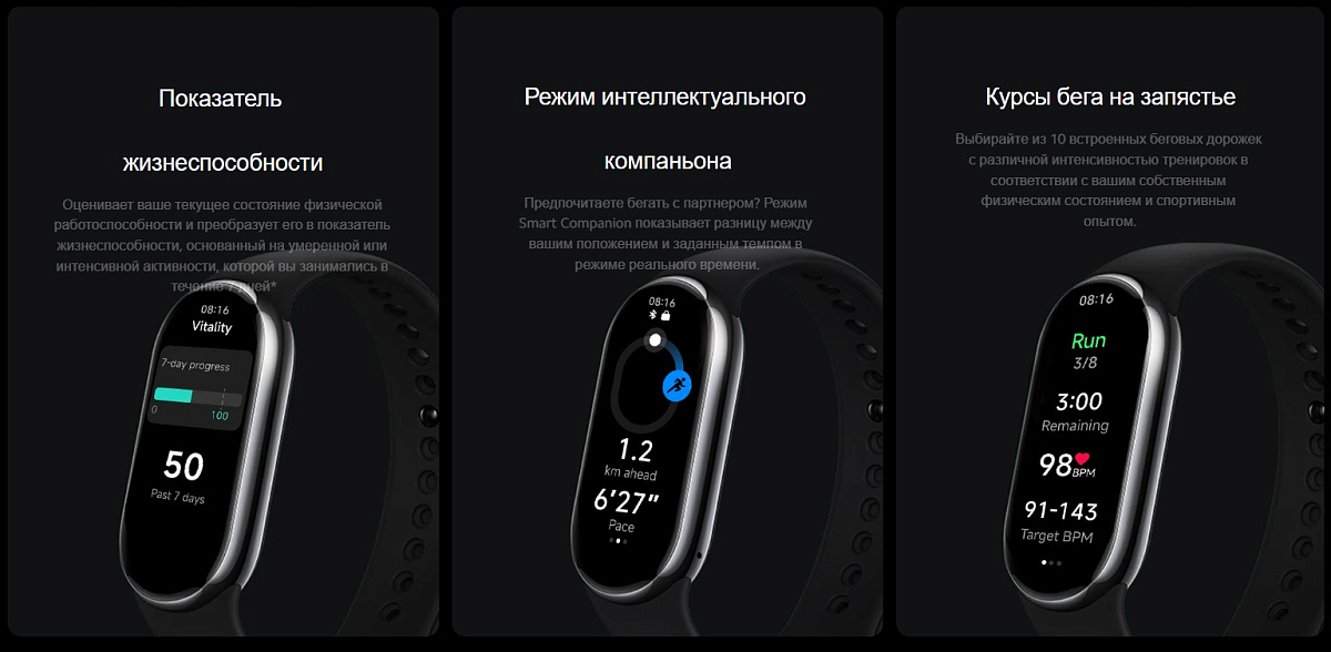 Особенности: Always On Display - постоянный вывод на экран основной информации; защита от попадания воды по стандарту 5 АТМ; разрешение дисплея 490х192 пикс, динамические циферблаты, спортивные режимы автоматическим с распознаванием начала тренировки; частота обновления экрана 60Гц; батарея 190 мАч; полная зарядка браслета за 1 час; элегантный корпус со стильной металлической отделкой теперь доступен в двух новых цветах средней части корпуса: золотисто-шампанском и графитово-черном; легко отстегивающиеся ремешки предоставляют еще больше возможностей для выражения вашего стиля с помощью различных дизайнов ремешков и материалов — и даже совершенно нового дизайна ожерелья; 200+ настраиваемых циферблатов