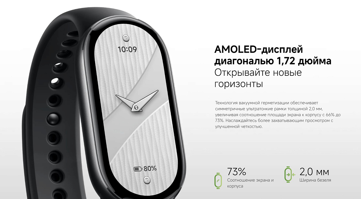 Особенности: новинка на HyperOS 2; яркость экрана 1500 нит; ёмкость аккумулятора 233 мАч; более 150 спортивных режимов; водозащита 5 атм;