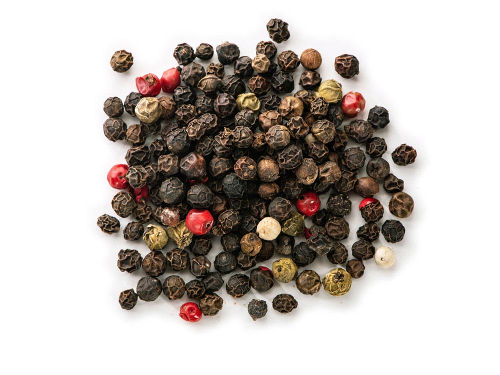 Свежемолотой смесью приправляют мясо, стейки, рыбу, овощи, грибы, салаты, соусы. В виде целых горошин перец добавляют в маринады для овощей. Состав: перец черный, белый, зеленый, розовый
