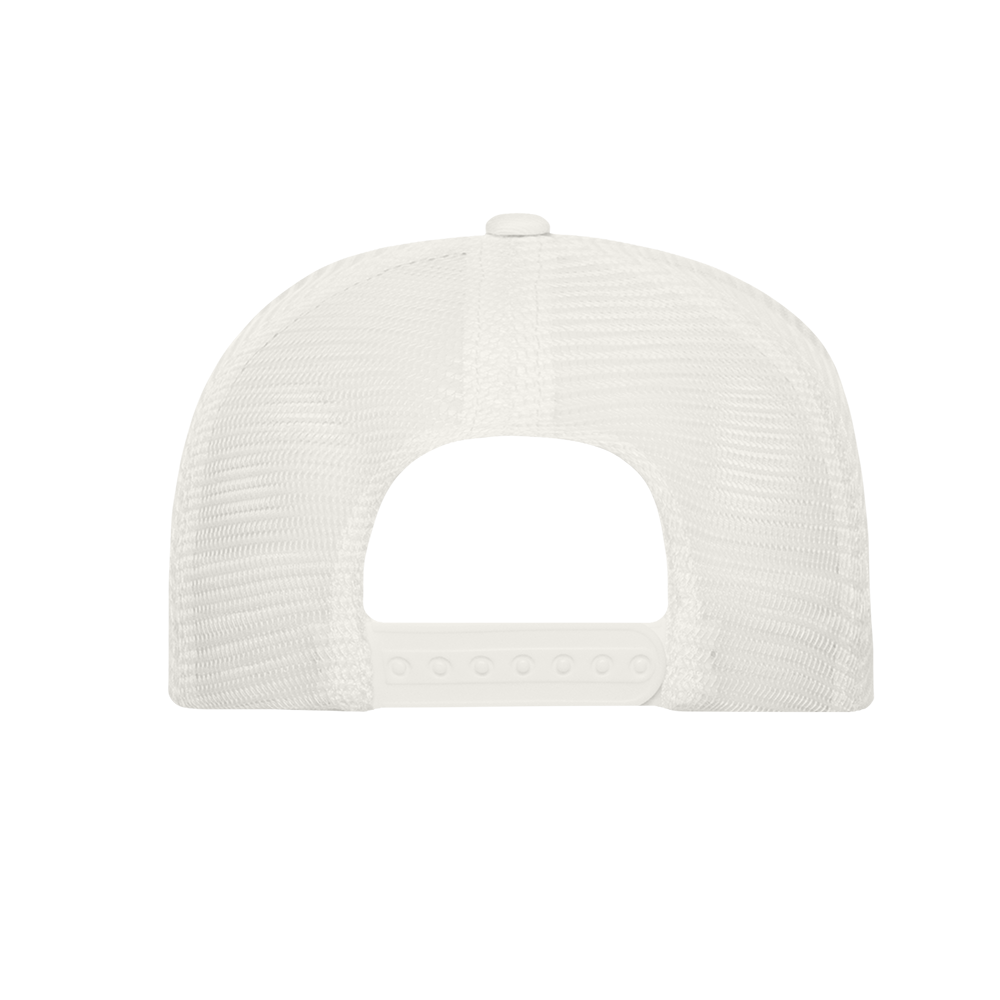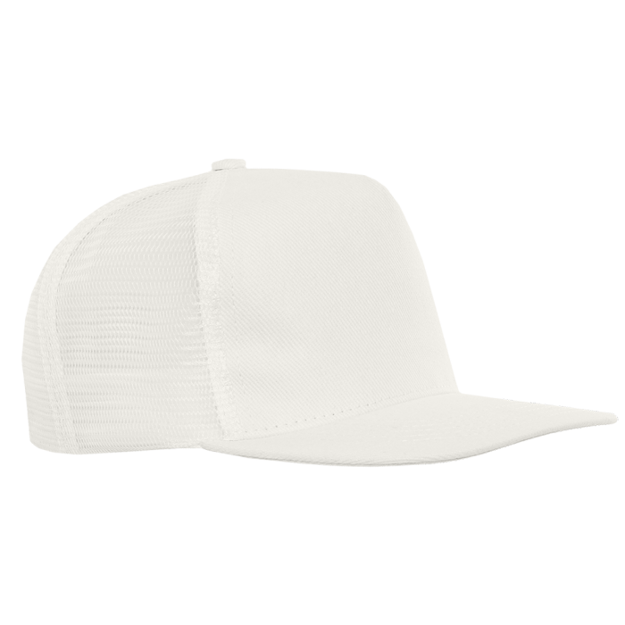 Бейсболка-пятиклинка с прямым жестким козырьком и пластиковой регулируемой застежкой, боковые клинья выполнены из жесткой сетки.