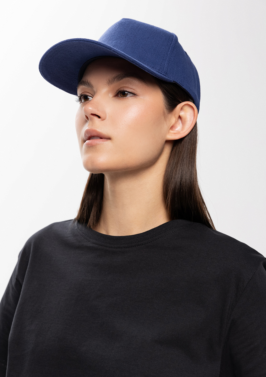 Бейсболка-пятиклинка без лобового шва с изогнутым жестким козырьком. Посадка регулируется ремешком на металлической застежке.