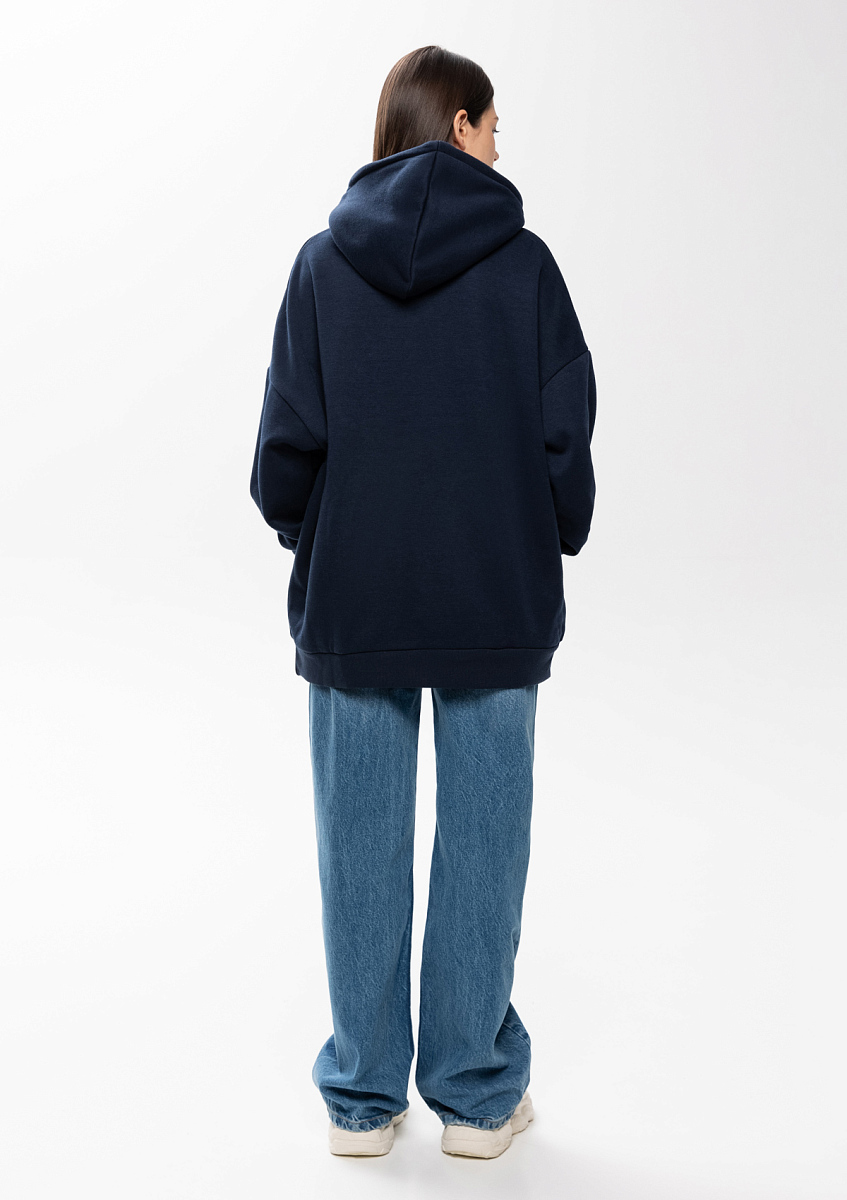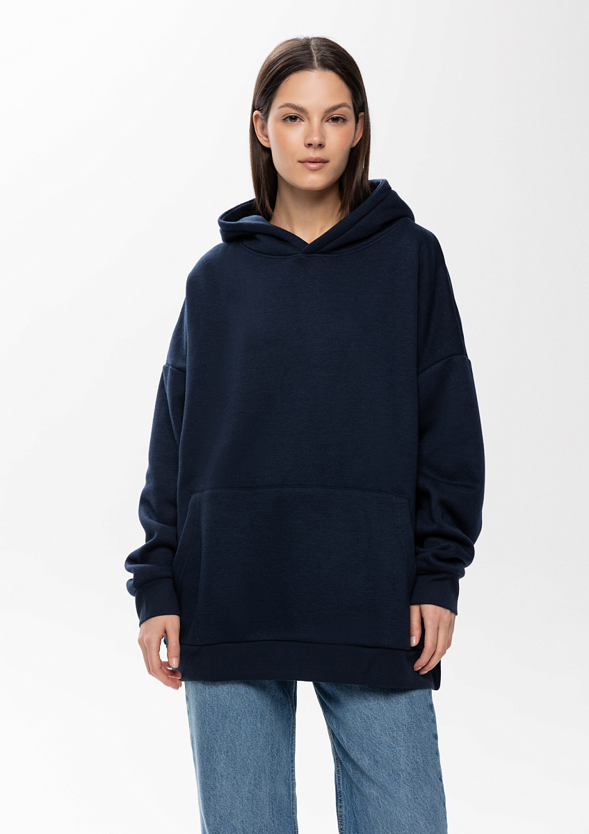 Толстовка свободного силуэта с капюшоном комфортной глубины, спущенной линией плеча и глубоким карманом-кенгуру. Манжет и низ изделия оформлены широкой эластичной резинкой в тон основному цвету.