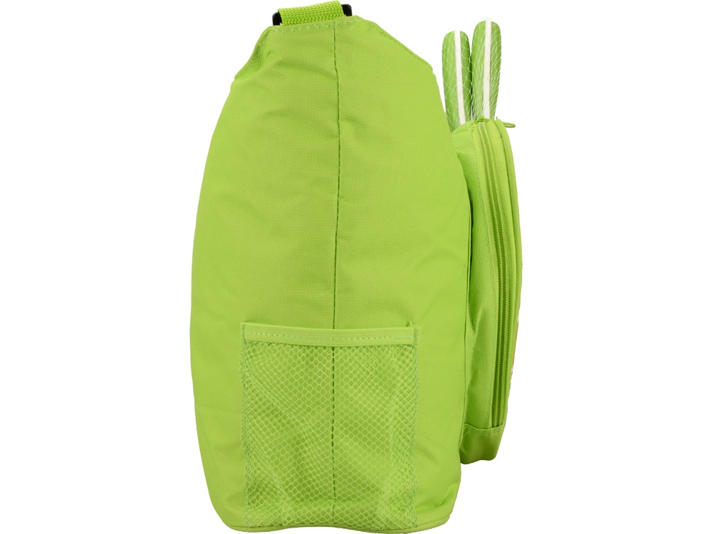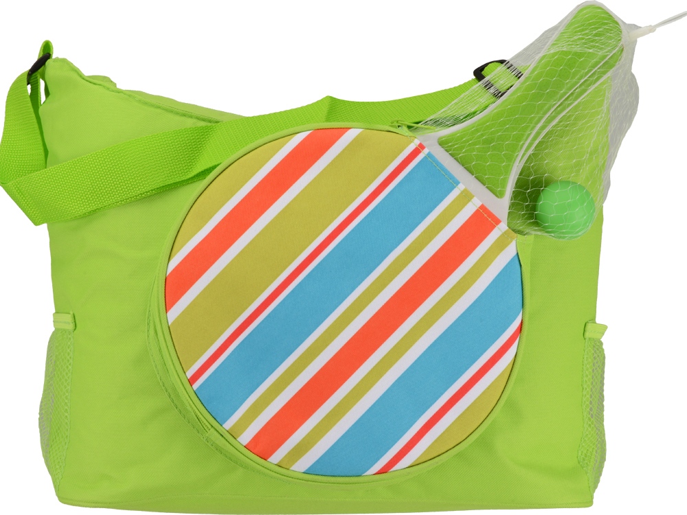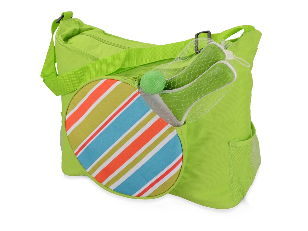Отличный набор – вместительная сумка-холодильник и комплект ракеток с мячом для игры в пляжный теннис. Отделение для ракеток находится прямо на сумке. По бокам сумки расположены сетчатые карманы для мелочей.