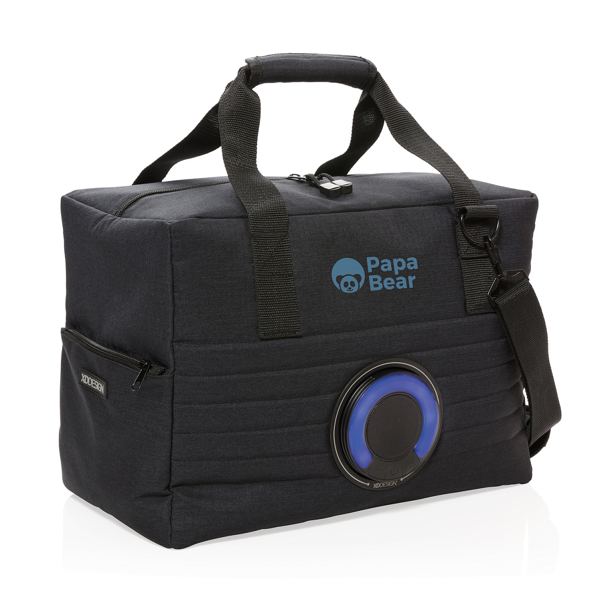 Вместительная и стильная сумка-холодильник Party – просто находка для веселых и динамичных людей. На передней части расположена съемная колонка, которая не только проигрывает музыку, но еще и светится, меняя при этом цвет. Колонка надежно защищена от попадания воды и пыли, степень защиты IPX5. При необходимости, беспроводную колонку можно снять и использовать отдельно, для этого нужно просто повернуть ее и потянуть на себя. Время работы без дополнительной подзарядки составляет 5 часов. Сумка рассчитана на 32 стандартные алюминиевые банки. Зарегистрированный дизайн® Длина 40 см., ширина 22 см., высота 28 см., диаметр 0 см.
