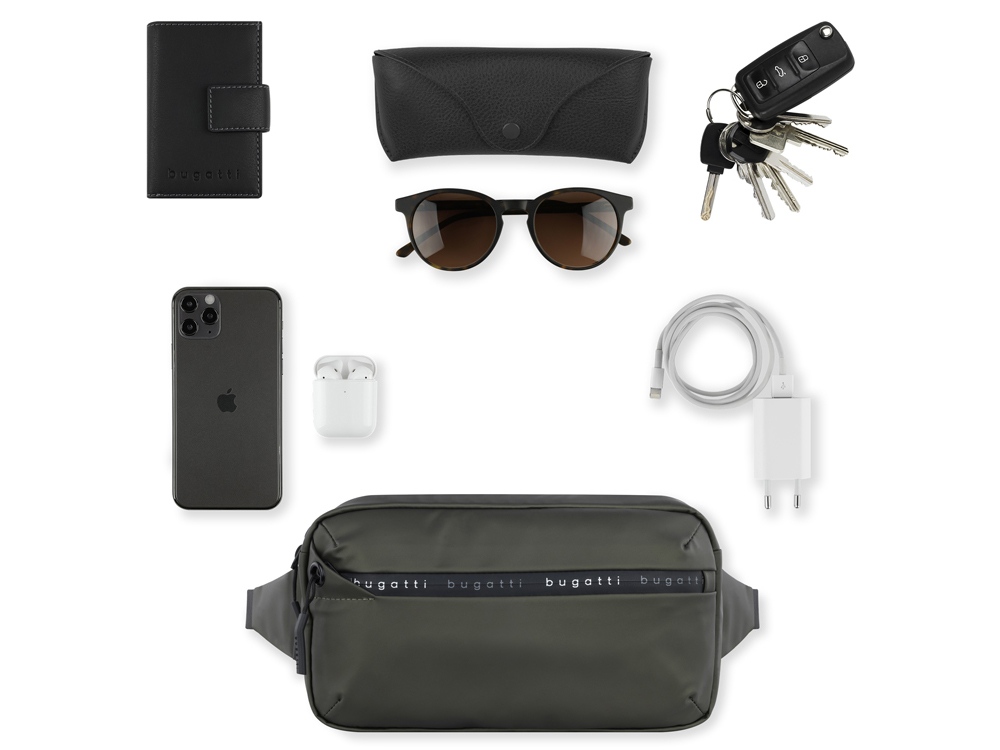 Внешняя организация: передний карман на молнии, задний карман на молнии, регулируемый поясной ремень (от 75 до 160 см)