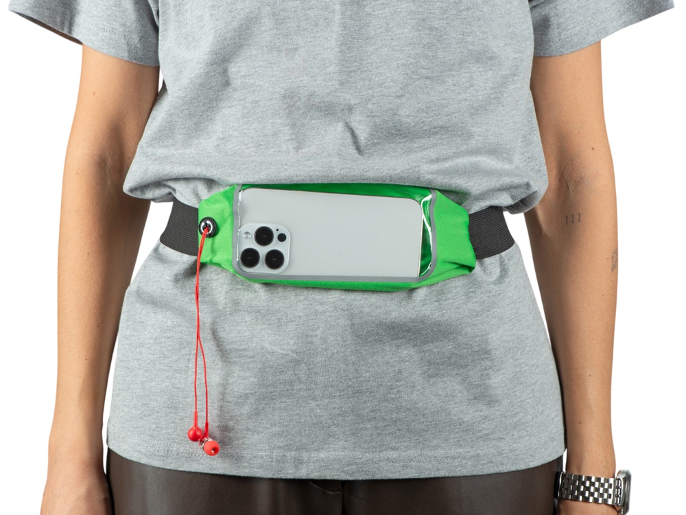 Сумка на пояс с отделением для смартфона размером до 16 х 8 см и выходом для наушников.