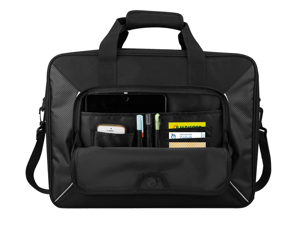 Эксклюзивная дорожная сумка со множеством отделений для различных устройств и аксессуаров. Большое основное отделение на молнии с мягким чехлом для ноутбука 15,6. Удобное отверстие, соединяющее основное отделение с карманом-органайзером, для подключения зарядного устройства к устройствам в сумке. Переднее отделение на молнии с карманом для планшета с подкладкой и карманами для мобильного телефона и аксессуаров. Отверстие для наушников на передней панели для подключения провода наушников к мобильному устройству. Включает нижнее основание, две мягкие ручки и регулируемый плечевой ремень с мягкой плечевой подкладкой.