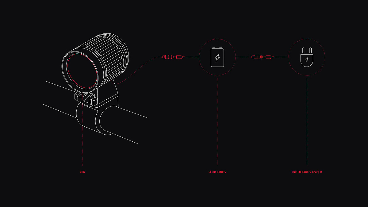 Особенности: светодиодный вело-фонарь; световой поток 2400 Люмен; аккумуляторный блок в комплекте
