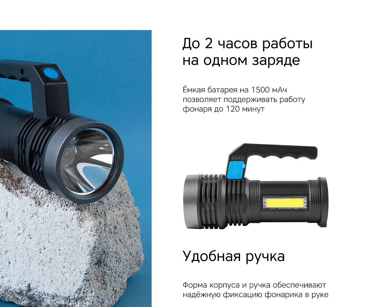 Особенности: встроенный аккумулятор обеспечивает длительное время работы без подзарядки; 3 режима работы: максимальная яркость, минимальная яркость и мерцание; удобная ручка обеспечивает надежный хват одной рукой; дополнительный светодиод в корпусе; зарядка от любого USB порта