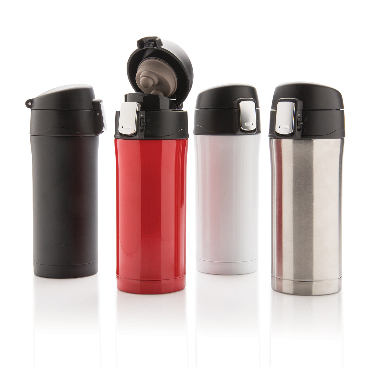 Термокружка Easy lock объемом 300 мл с двойными стенками из нержавеющей стали сохранит температуру горячего чая или кофе до 5 часов и холодного напитка до 15 часов. Запирающаяся крышка полностью устраняет риск протекания или пролива. Крышка легко моется в том числе, в посудомоечной машине. Уникальный дизайн идеально подходит для того, чтобы держать, открывать и закрывать термокружку одной рукой. Размер термокружки подходит для всех автомобильных подстаканников. Длина 7 см., ширина 7 см., высота 19 см., диаметр 6,5 см.