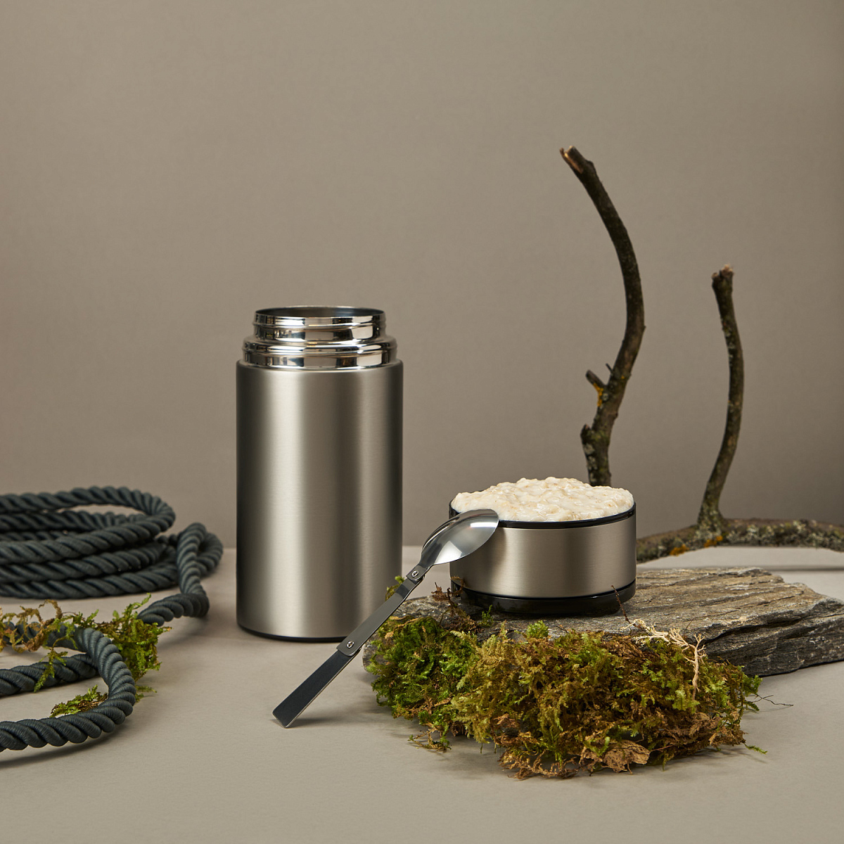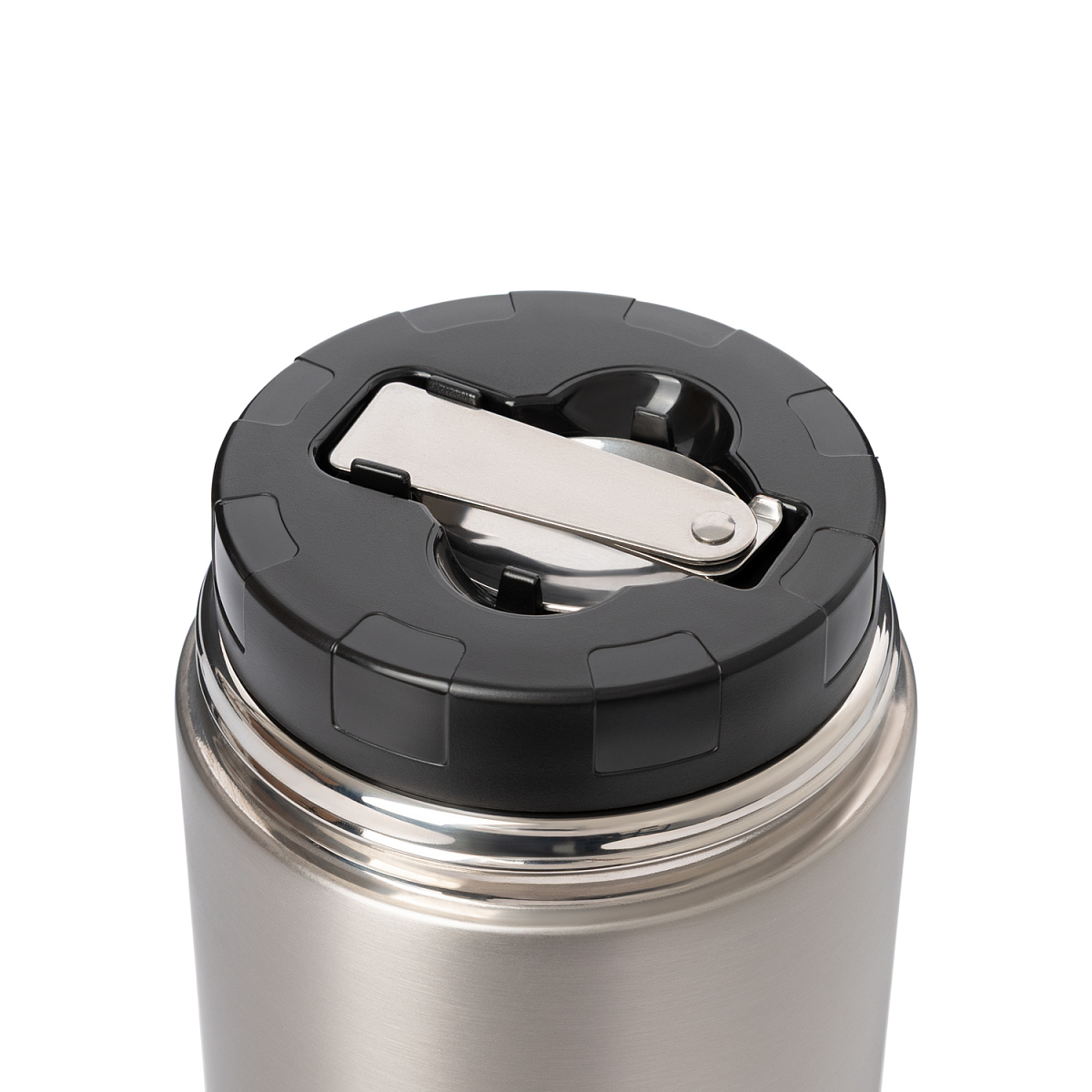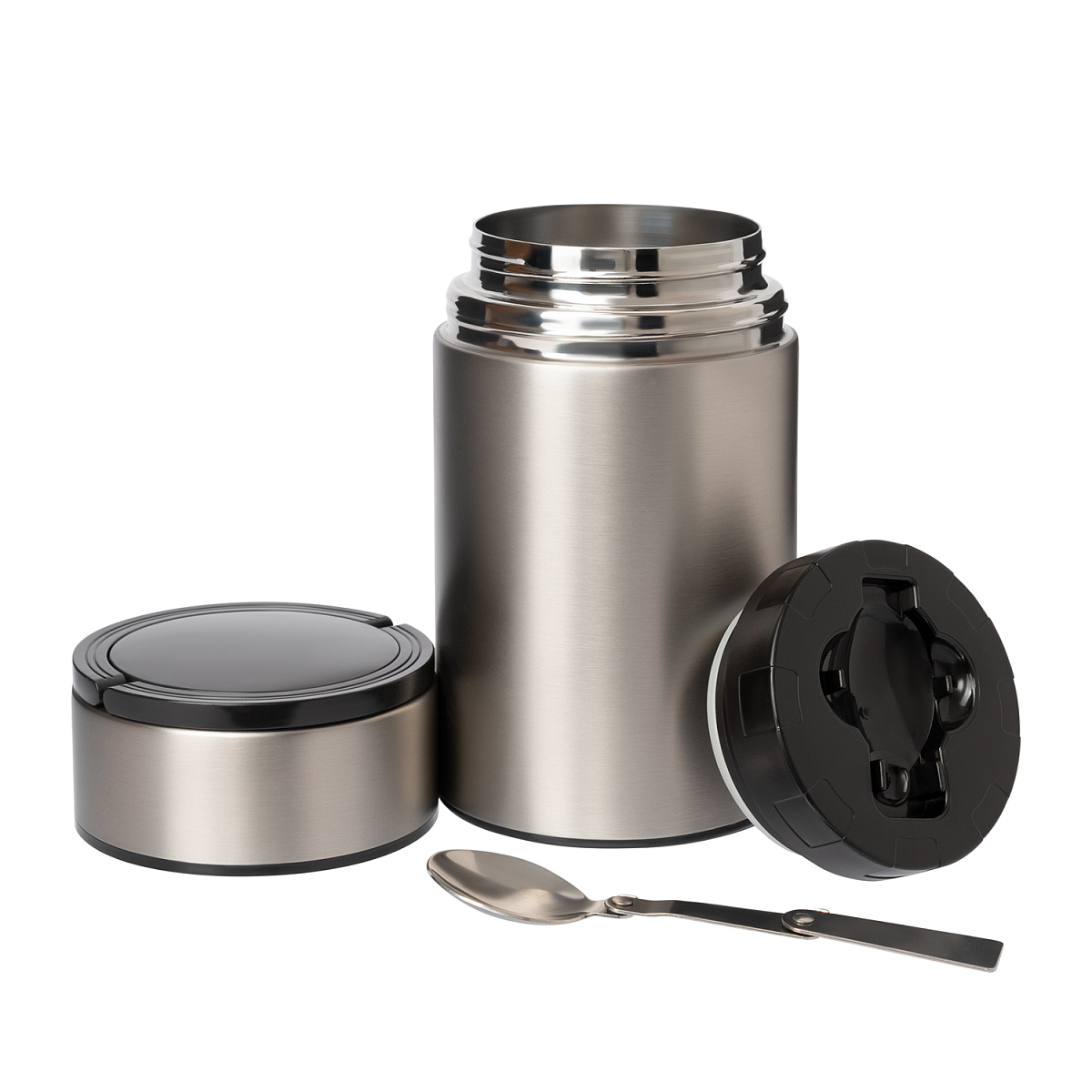 Внутренняя крышка оснащена специальным отсеком, в котором находится складная ложка из высококачественной стали 304 марки. Вакуумная конструкция из нержавеющей стали надежно сохраняет тепло.