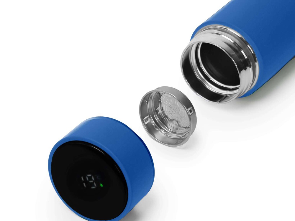 Термос из нержавеющей стали, покрытый цветным soft touch, с крышкой, в которой встроен термометр и LED дисплей, показывающий температуру внутри термоса. Объем: 500 мл. Упаковка: каждый термос в крафт коробке.