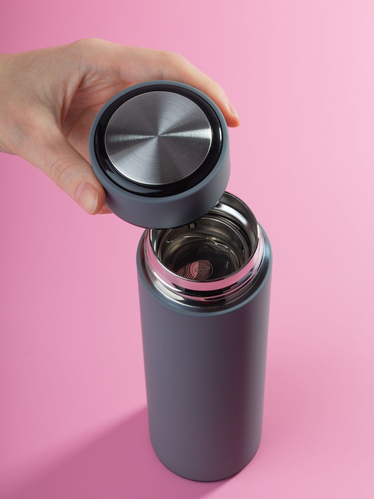 Компактный термос Percola пригодится и в городе, и на природе. Съемное ситечко поможет заварить чистую чашку чая или кофе, а цилиндрический корпус даст широкие возможности для маркетинговых сообщений.