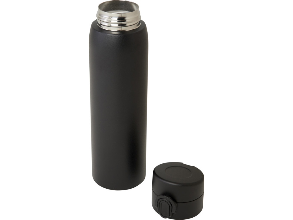 Стильная фляга-термос из переработанной нержавеющей стали, сертифицированная RCS, с простым механизмом открытия с помощью кнопки. Фляга герметична, а благодаря медной вакуумной изоляции напитки будут сохраняться горячими или холодными в течение нескольких часов. Объем составляет 450 мл. Поставляется в подарочной коробке из переработанного картона. Recycled stainless steel, Recycled PP Plastic. Packaging: FSC Mix Credit P5.1 CU-COC-877277.
