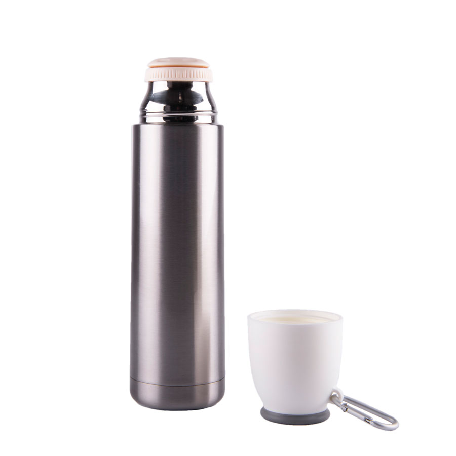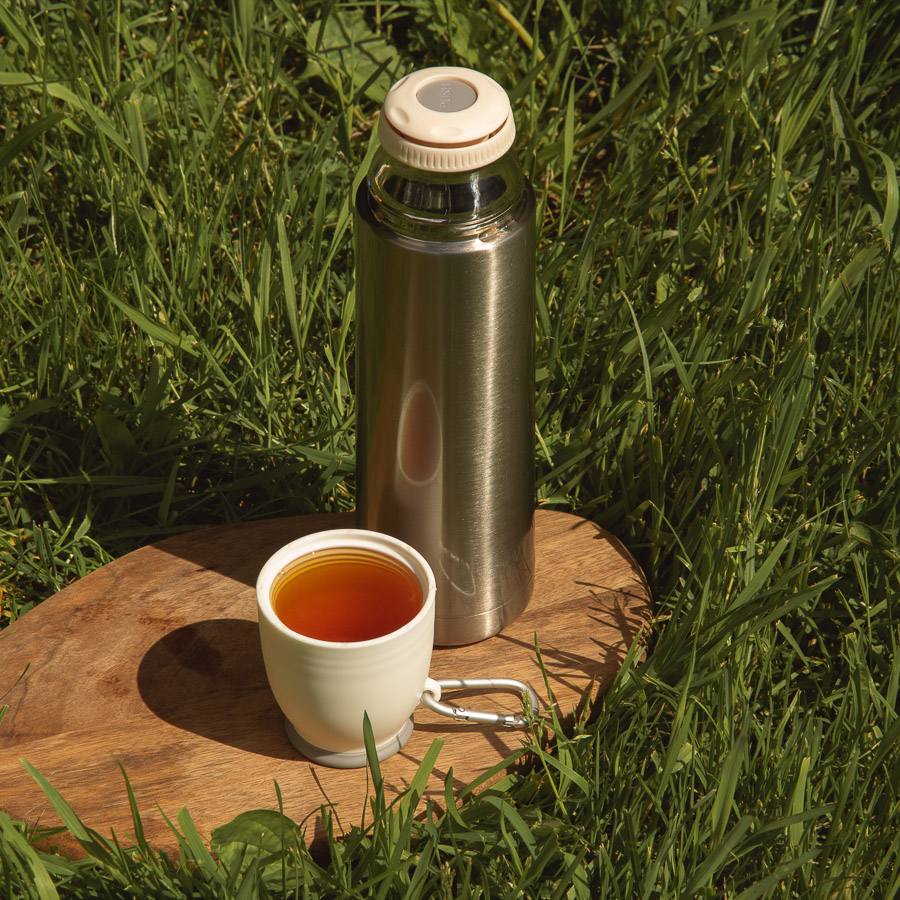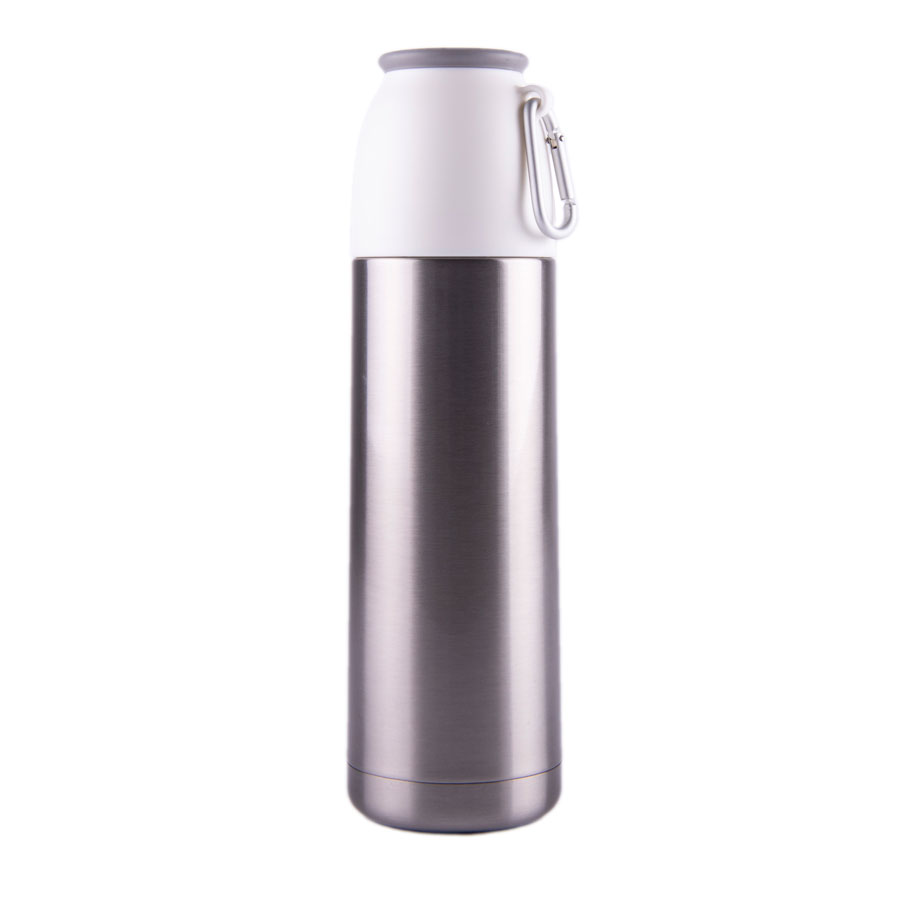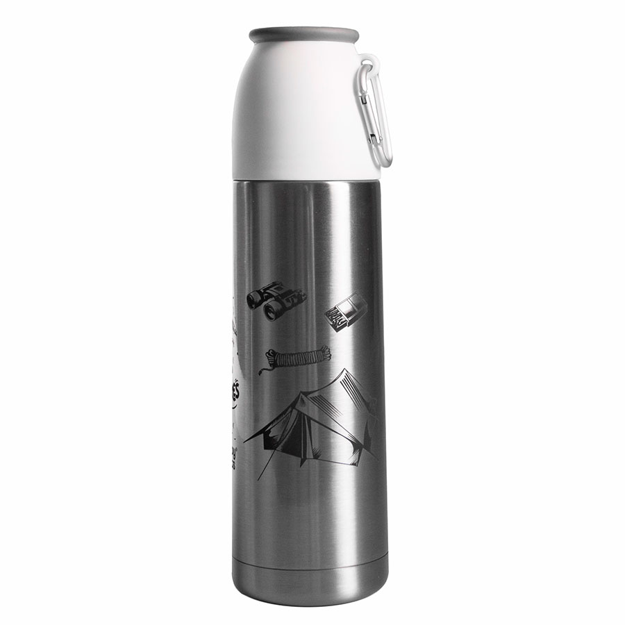 Вакуумный термос Escape с двойными стальными стенками. На крышке термоса – карабин. Удобно брать в поход, пристегнув к рюкзаку (не занимает место внутри рюкзака). Сохраняет тепло до 12 часов в зависимости от температуры окружающей среды.