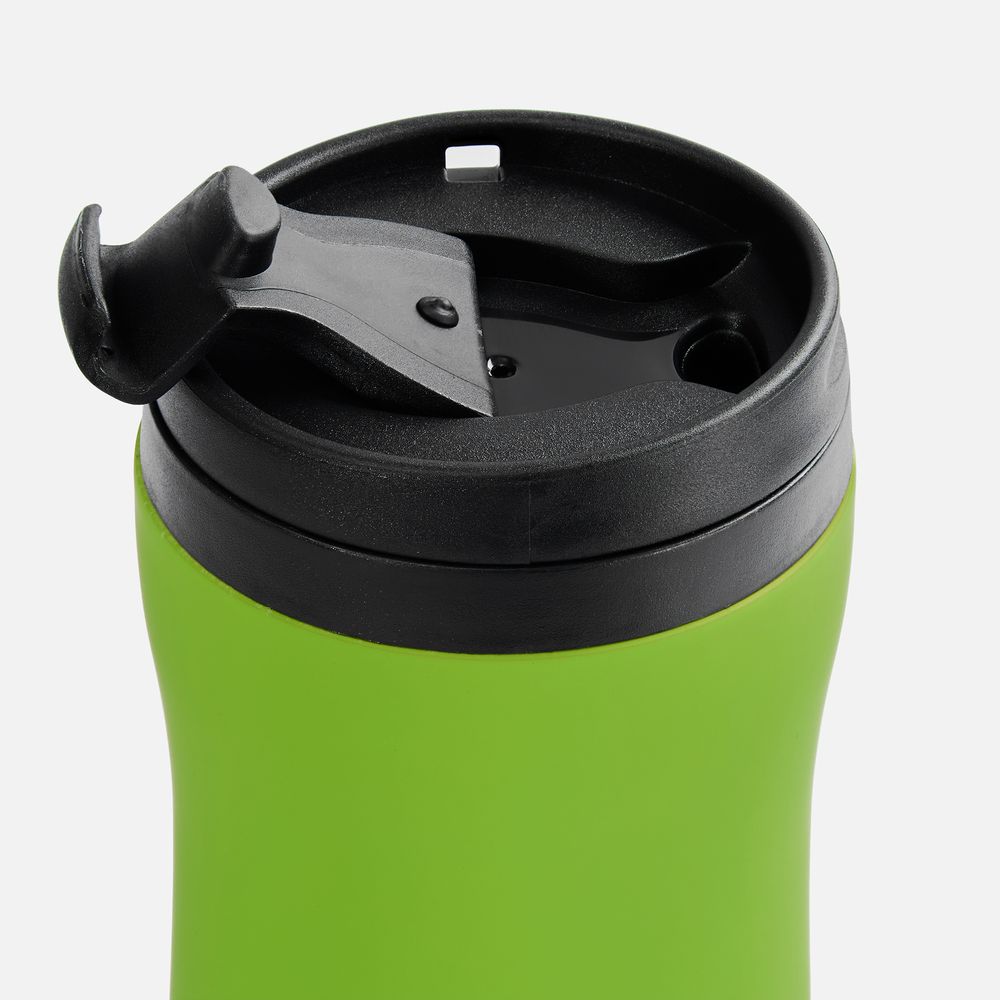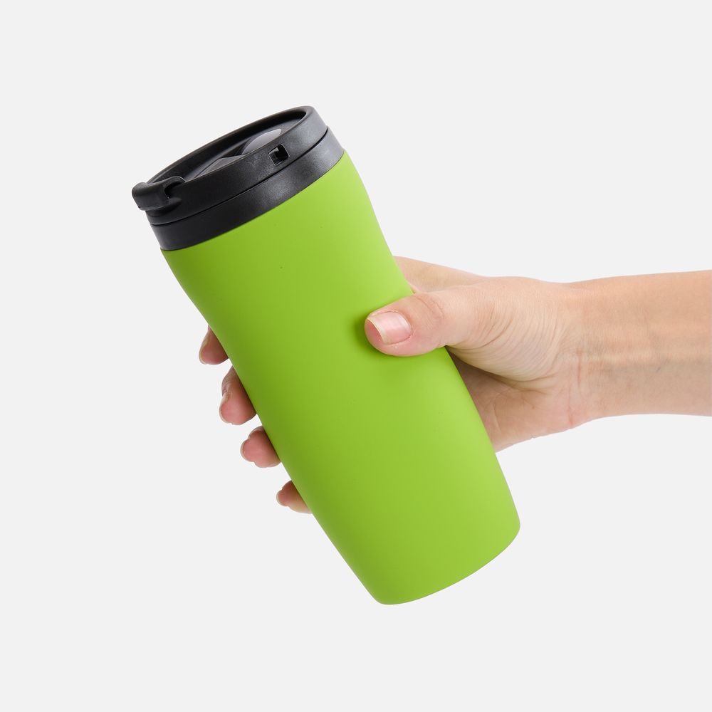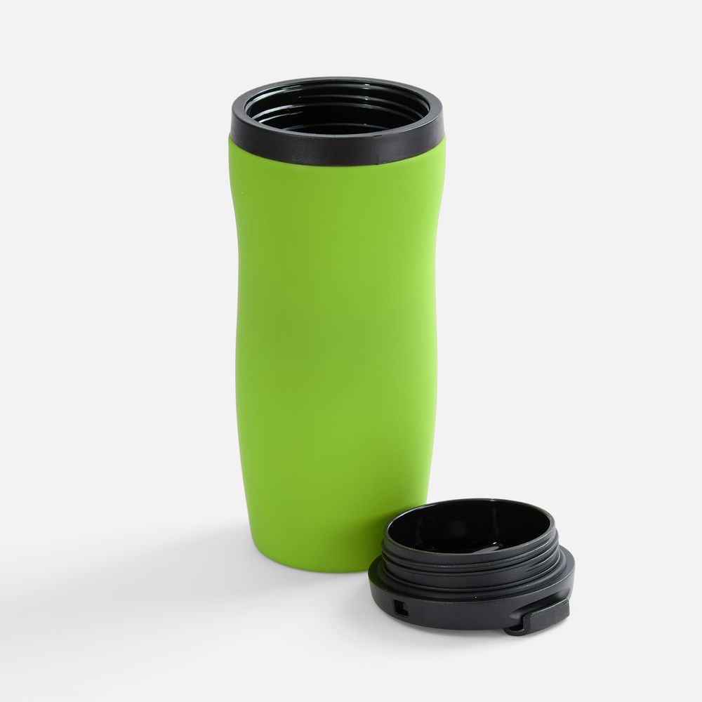 Двухслойная конструкция из нержавеющей стали снаружи и пищевого пластика внутри. Герметичная завинчивающаяся крышка с откидным клапаном для питья. Покрытие софт-тач. В отверстие в крышке можно вставить шнурок для удобного ношения стакана на руке. Шнурок в комплект не входит.