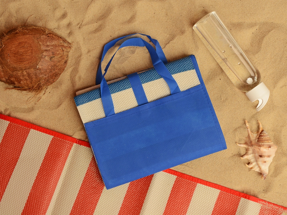 Прочная и яркая циновка обеспечит комфортный отдых на пляже. Циновку можно компактно сложить в форме сумки и переносить на плече, благодаря надежным лямкам.