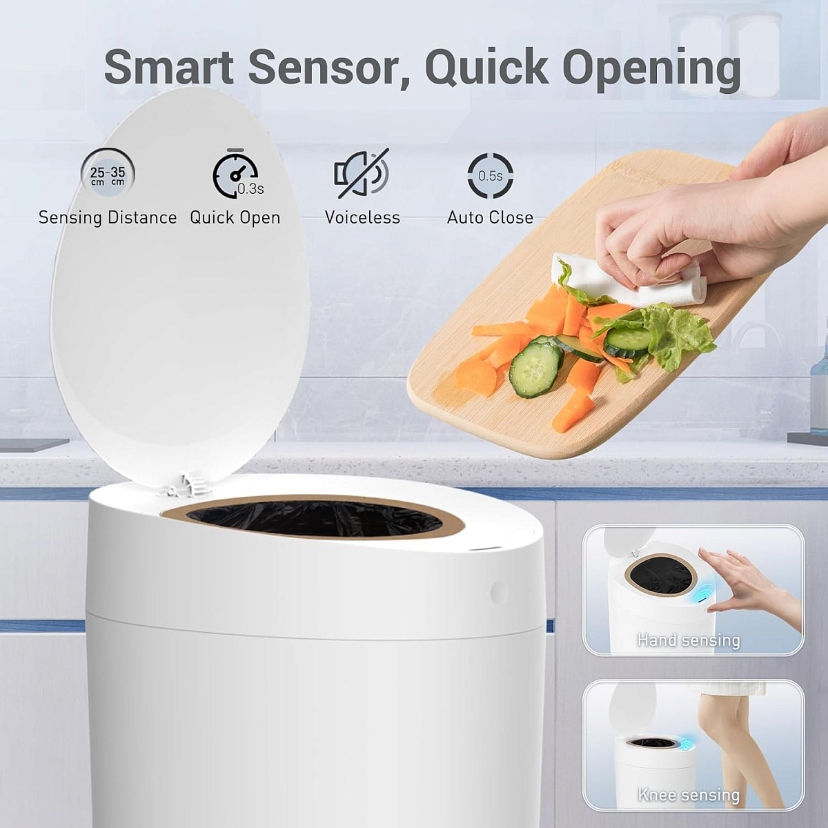 Особенности: корзина оснащена встроенным датчиком, который автоматически определяет уровень заполнения; расстояние реагирования до 35 см; удерживайте палец на сенсорной кнопке в течение 3 секунд, чтобы запустить процесс запечатывания мусорного пакета; интегрированная технология демпфирования для обеспечения бесшумной работы при открытии и закрытии; заполненный мусорный пакет запаивается сверху и срезается таким образом, чтобы верх одного пакета стал дном другого; ; ;