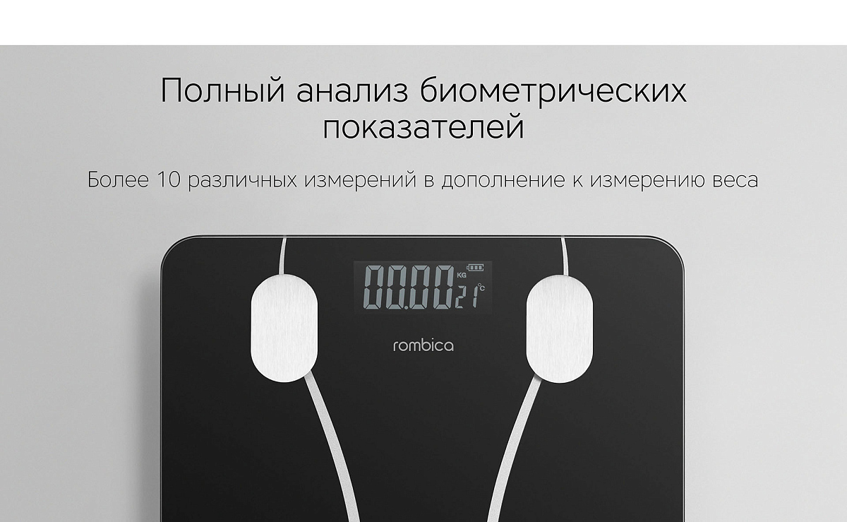 Особенности: соединение с приложением на телефоне через Bluetooth (доступно приложение Android и iOS); LED-дисплей отображает вес, температуру тела и заряд источника питания; дополнительная функция измерения температуры окружающей среды; измерение более 10 показателей организма (жир, белки, костная масса и тп)