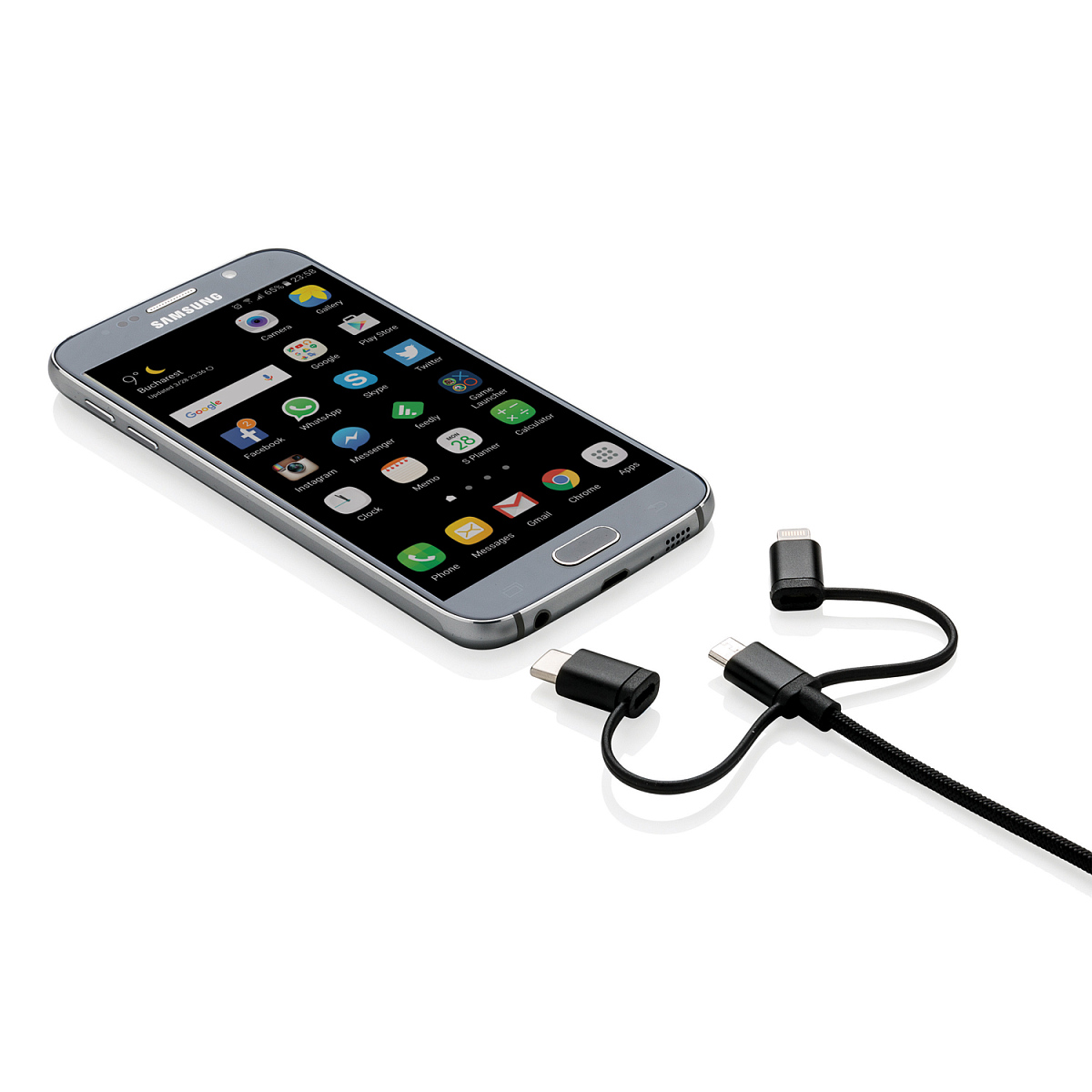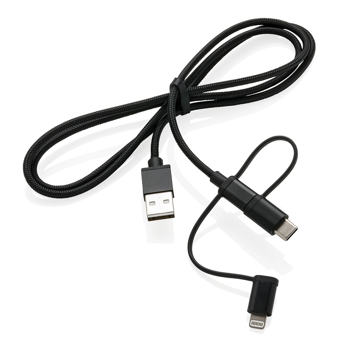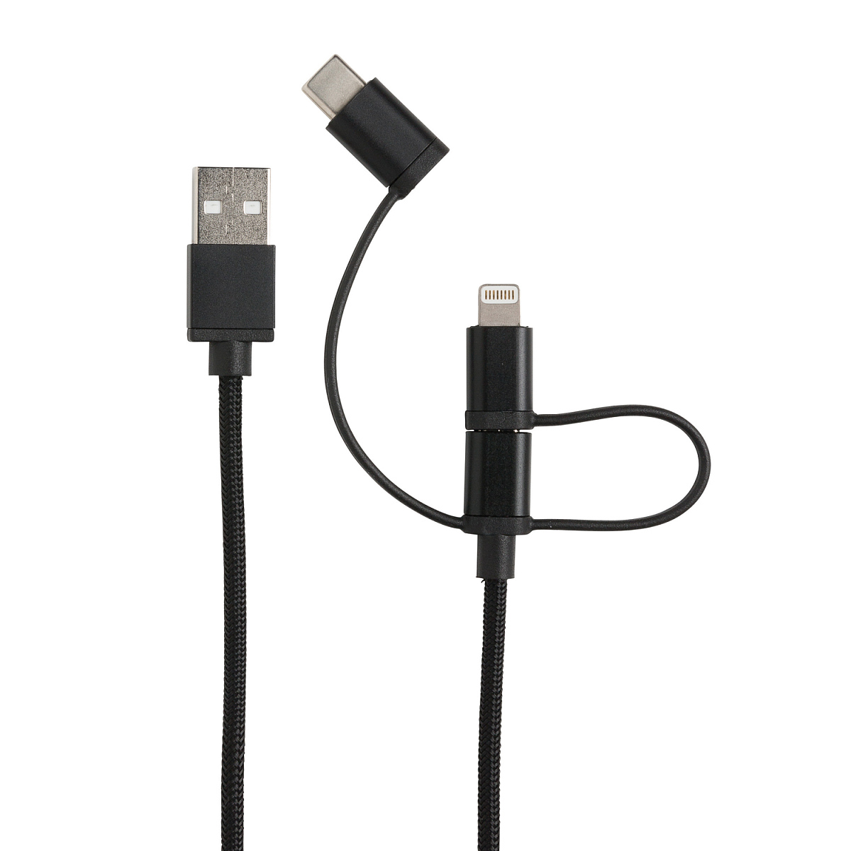 Универсальный кабель с тремя выходами: micro-USB, Type-C и лицензированным MFi lightning подходит не только для зарядки мобильных устройств, но и для передачи данных. Длина кабеля составляет 1м. Идет в комплекте с удобным нейлоновым мешочком для хранения кабеля. Длина 0,5 см., ширина 2 см., высота 104 см., диаметр 0 см.