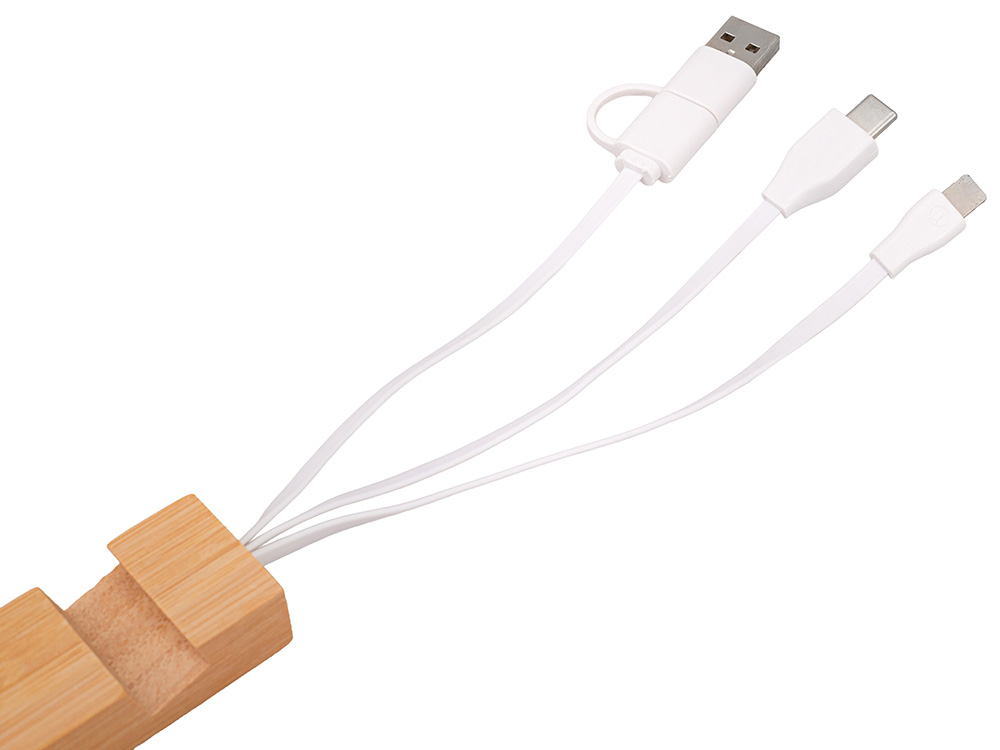 Корпус кабеля выполнен из натурального бамбука — экологически чистого и прочного материала. Деревянная подставка не только защищает кабель от перегибов, но и служит удобной опорой для телефона при видеозвонках, прослушивании музыки или просмотре видео.