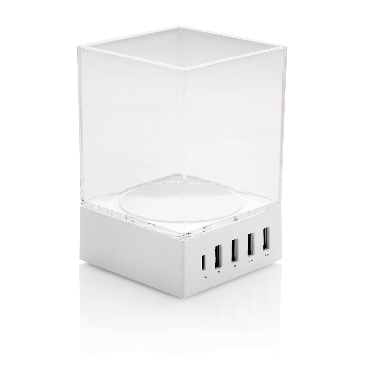 Стильный USB-хаб с подставкой для ручек, выполненный в минималистичном дизайне, проследит, чтобы все устройства были заряжены, а на рабочем столе царил порядок. В устройстве предусмотрены 4 порта USB (4,8 А) и один порт Type-C 2.0 для мобильных устройств нового поколения. Индикаторы синего цвета покажут, заряжается ли устройство. Подставка изготовлена из поликарбоната, а USB-хаб — из огнестойкого ABS-пластика. Длина кабеля — 1,5 метра. Длина 12 см., ширина 8,2 см., высота 8,2 см., диаметр 0 см.