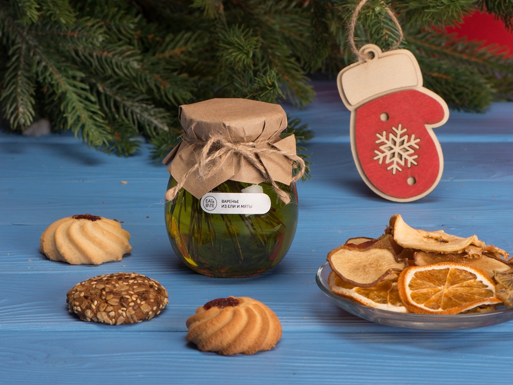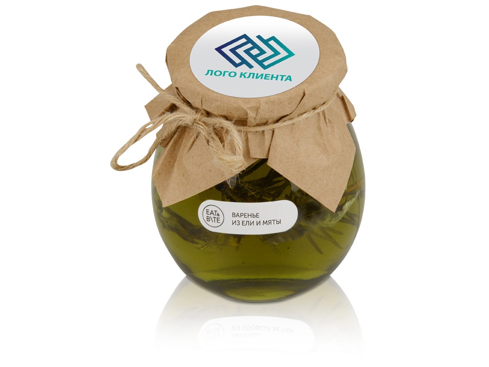 Мы привыкли, что варенье варят из фруктов и ягод. Поэтому рецепт варенья из ели выглядит достаточно необычно. Мята в сочетании с ароматом ели – это вкусный и необыкновенно полезный продукт. Варенье из ели и мяты можно добавлять в различные коктейли, что будет придавать пикантность напитку. Этот вкусный подарок поможет прогнать усталость от дневных забот. Банка варенья обернута крафт-бумагой, на которую возможно сделать нанесение корпоративного логотипа.