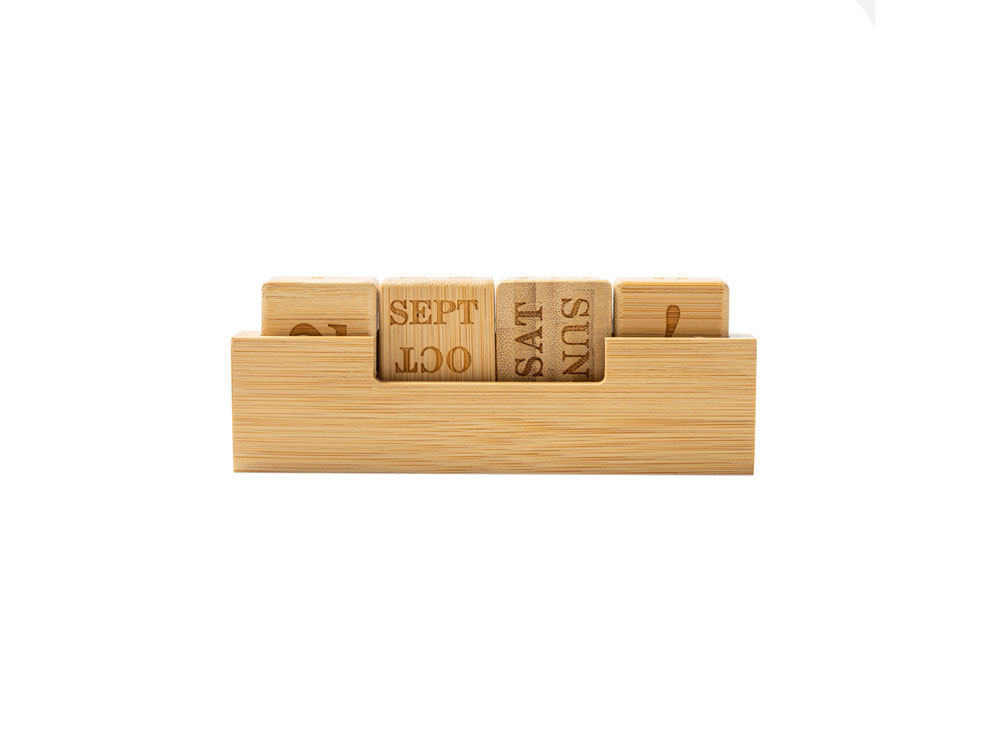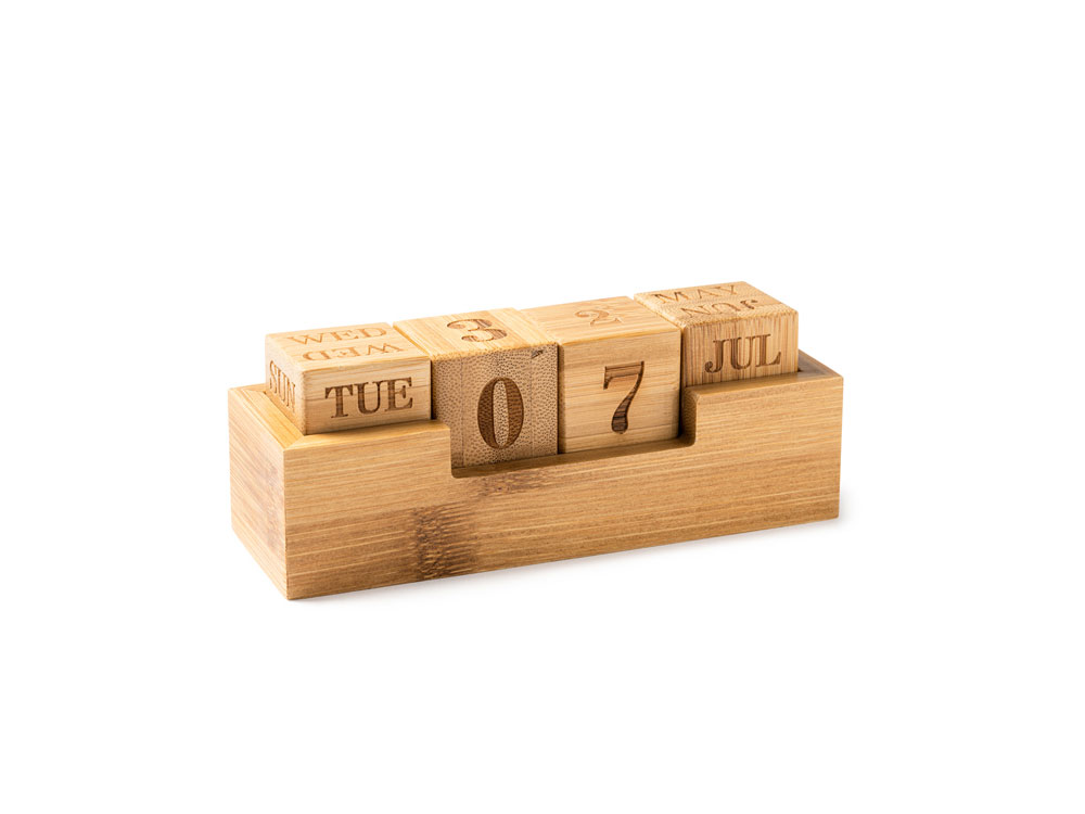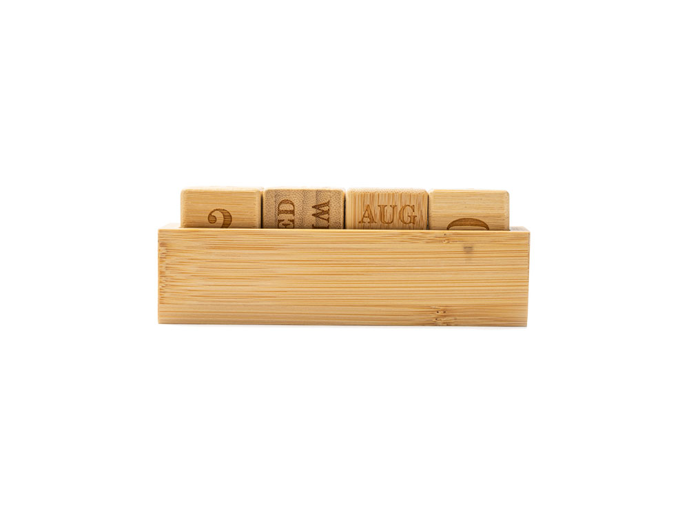 Вечный настольный календарь из бамбука, состоящий из одной подставки и четырех блоков с гравировкой.