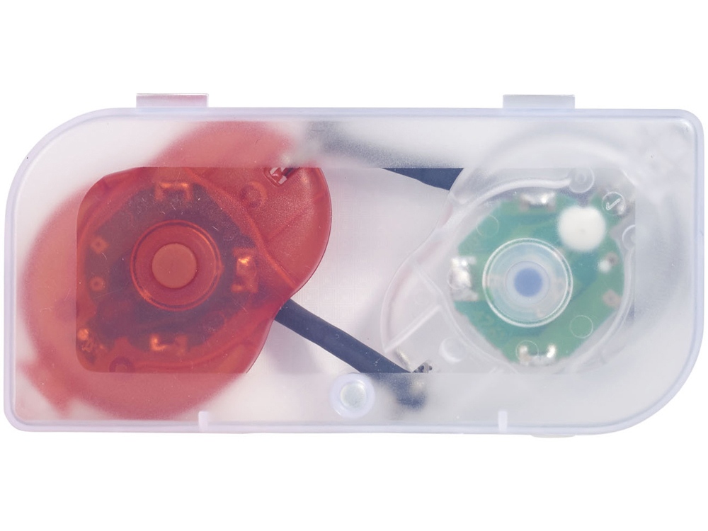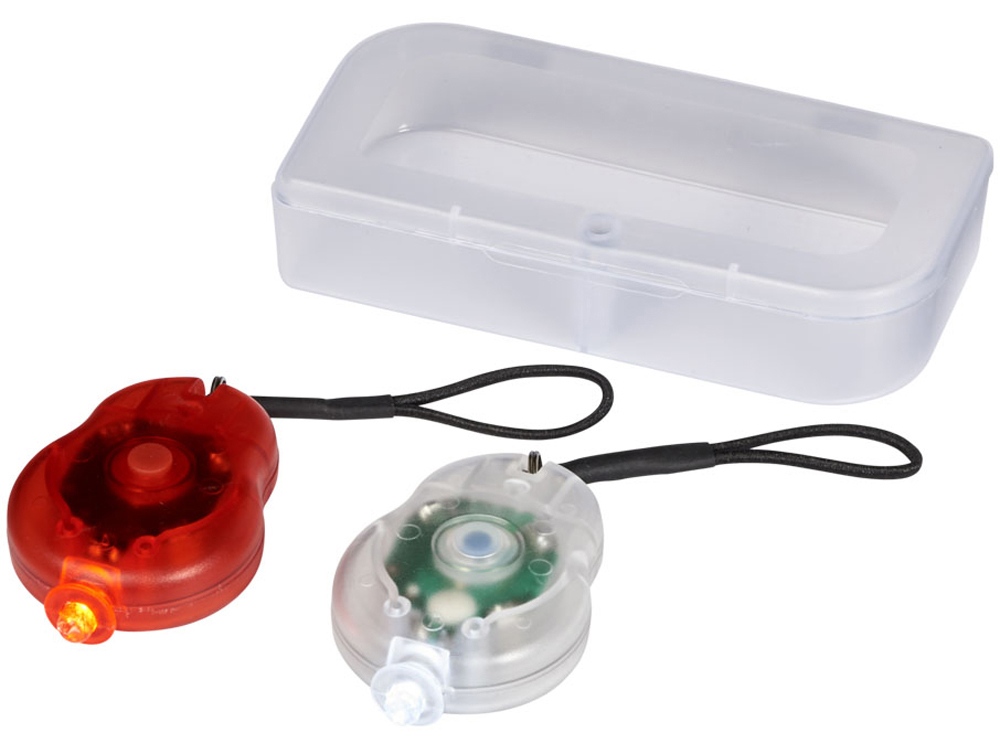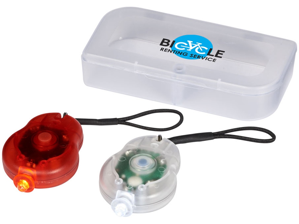 Велосипедный фонарь Zeta в футляре, 2 шт. Комплект из двух велосипедных фонарей: красный и белый светодиодные фонари с ремешком для крепления. Поставляется в пластмассовом футляре. Батарейки включены в комплект. ПП-пластик.