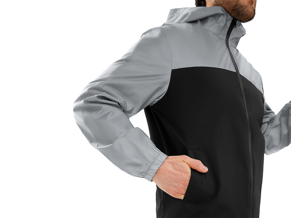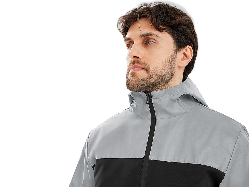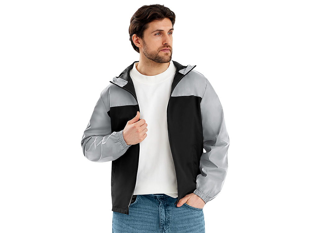 Streetwear-ветровка с контрастным дизайном: верх переда и спинки, рукава и капюшон — из светоотражающей ткани, низ — из прочной чёрной полиэстеровой ткани. Модель на подкладке, со спинкой длиннее переда.