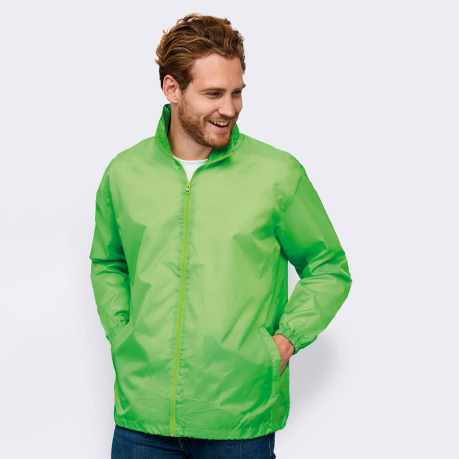 Легкая ветровка унисекс с облегченной пластиковой молнией. Воротник с убирающимся капюшоном. Эластичные манжеты на резинке.