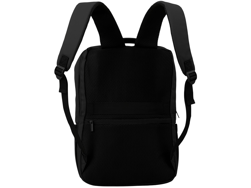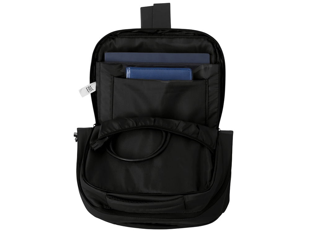 Непромокаемый бизнес рюкзак с двумя вместительными отделениями и карманом на молнии спереди. В одном отделении расположены карман для ноутбука и планшета, в другом органайзер и много пространства для одежды и других вещей на случай деловой поездки. На сетчатой спинке расположен потайной кармана на молнии для документов и личных вещей и ремень для крепления на ручку чемодана. Сверху удобная мягкая ручка для переноски. Лямки регулируются по длине.