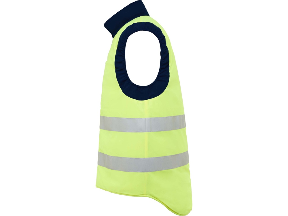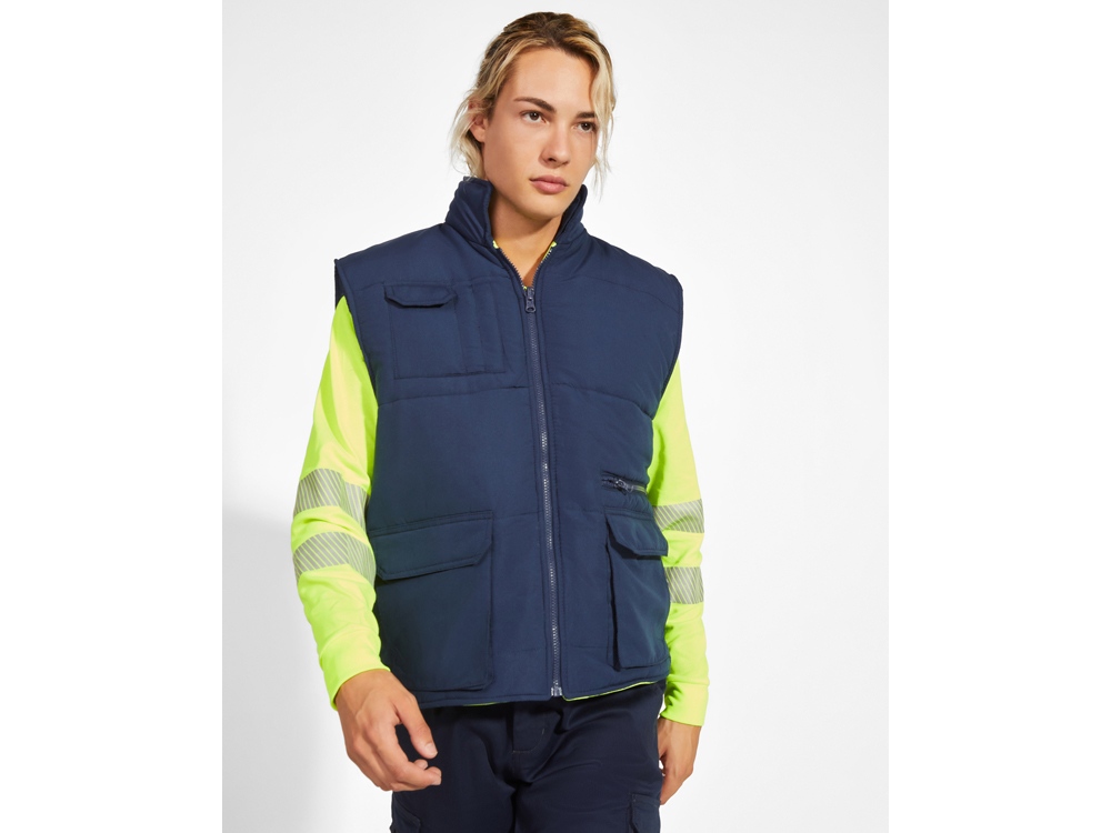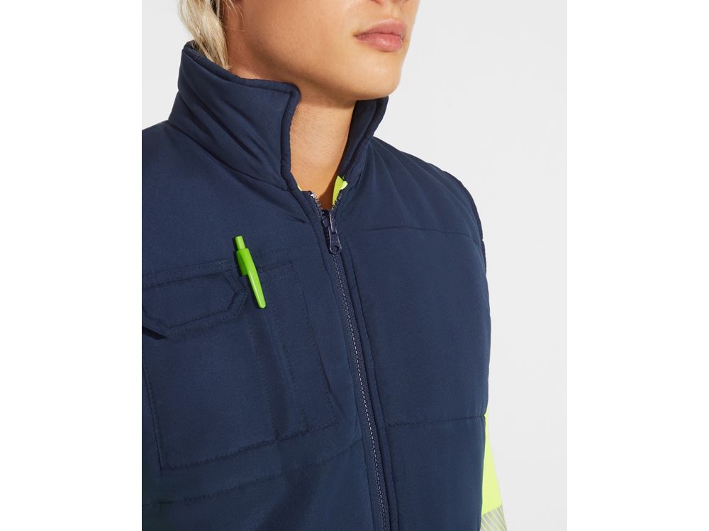 Двусторонний жилет с карманами и высоким воротником. Жилет с несколькими карманами. · Застежка·молния спереди с двусторонним бегунком. · Правый наружный карман для мобильного телефона. · Два передних кармана с боковыми прорезями. · Два кармана для ручек. · Карман на застежке·молнии. · Ветровики на манжетах. · Приталенный низ. · Эластичный регулятор. · Светоотражающие элементы на жилете. · Флуоресцентный цвет. · Две горизонтальные светоотражающие полосы.