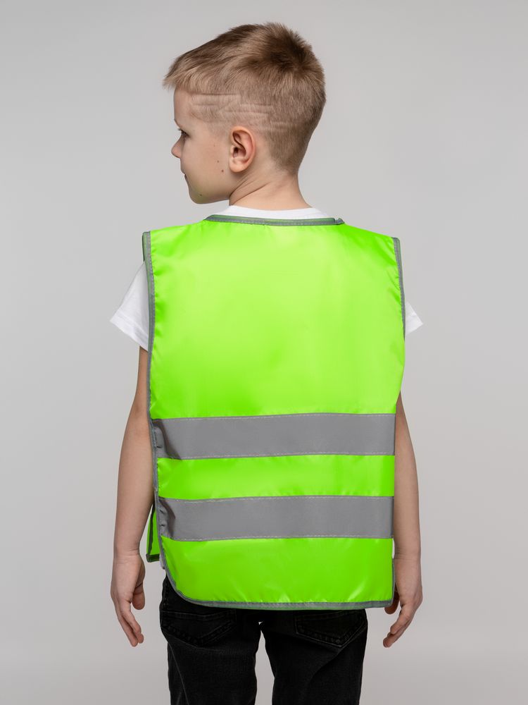 Детский светоотражающий жилет с застежкой-липучкой с одной стороны. Надевается через голову.