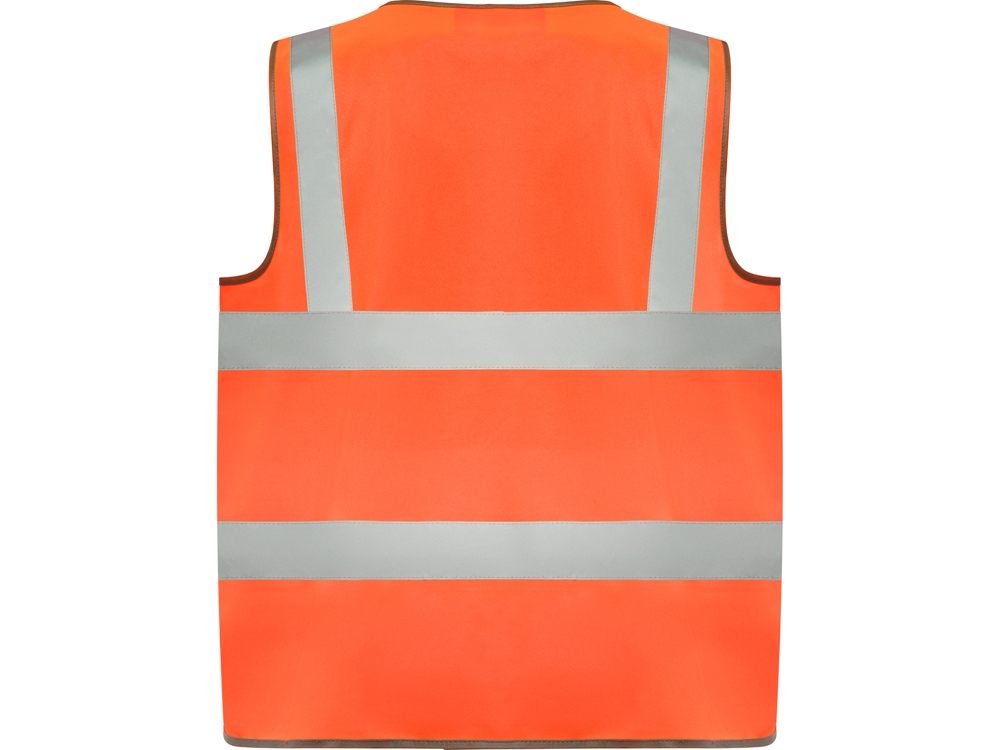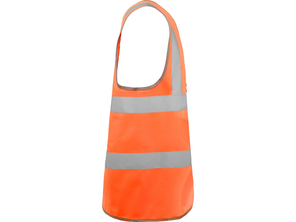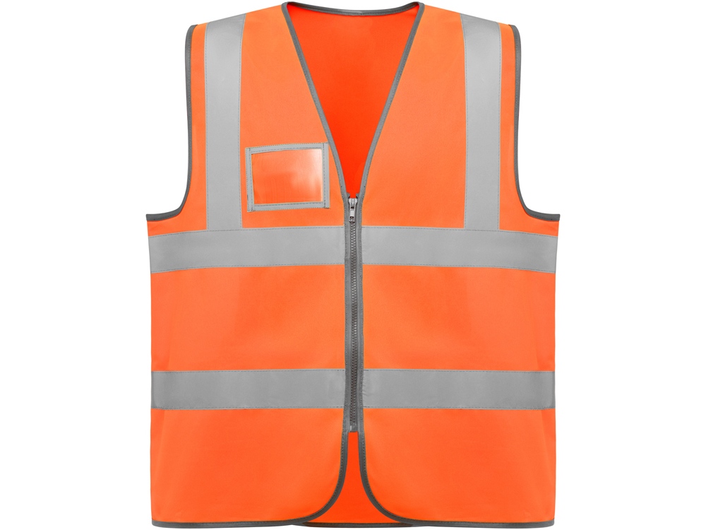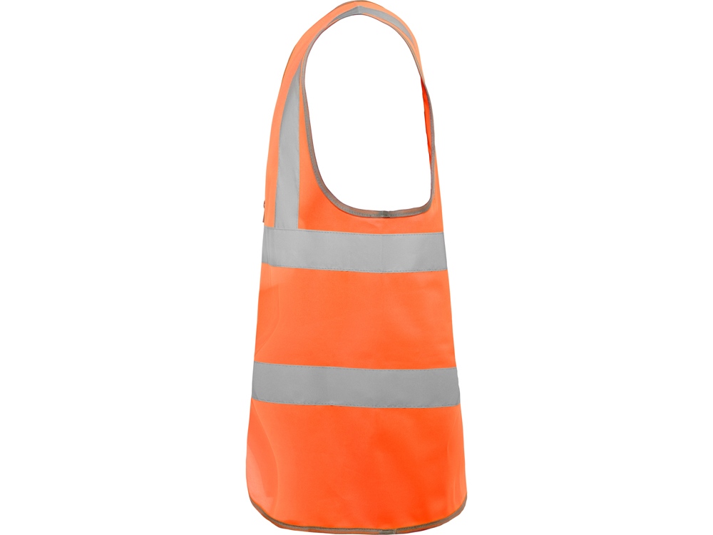 Жилет светоотражающий на молнии. Две горизонтальные светоотражающие полосы на полочке и одна по плечам. Прозрачный карман на груди справа.