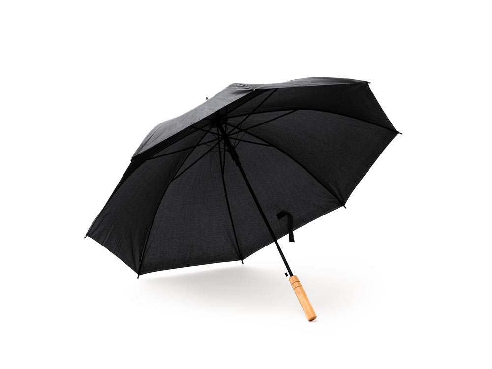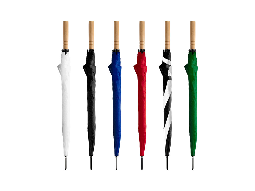Зонт с деревянной ручкой и автоматическим открытием. Спицы и отделка черного цвета. Застежка на липучке.