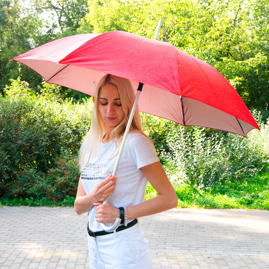 Зонт-трость, полуавтомат.Диаметр купола: 103 см., длина стержня 88,5 см.Состав купола: 100% полиэстер 190TСостав стержня: металл.Состав спиц: металл.Ручка: пластик.Цвет купола: внешняя часть pantone 1805 С, внутренняя часть Pantone 877 С.Двухцветная базовая модель зонта с изюминкой! Внутренняя часть купола серебристого цвета. Упаковка – пластиковый пакет