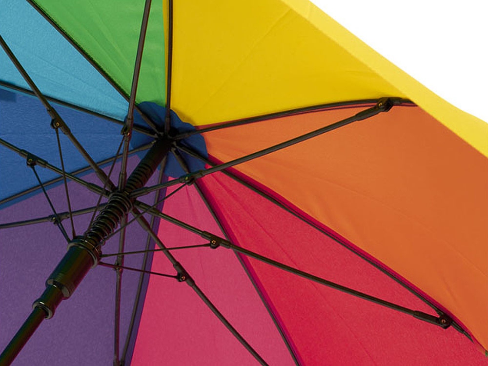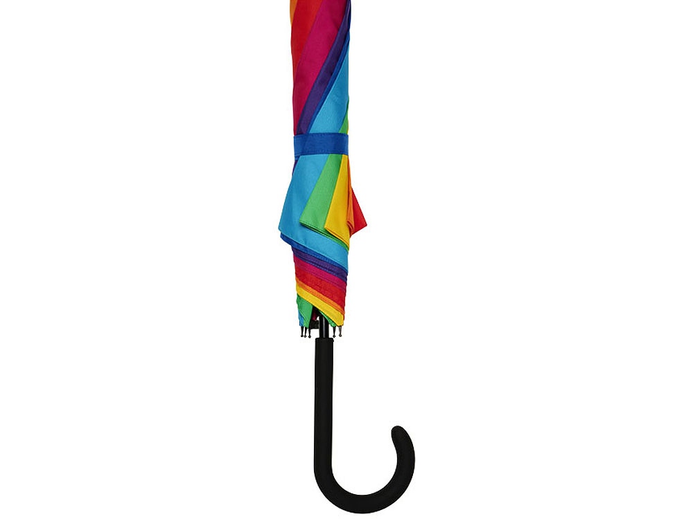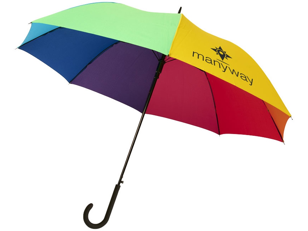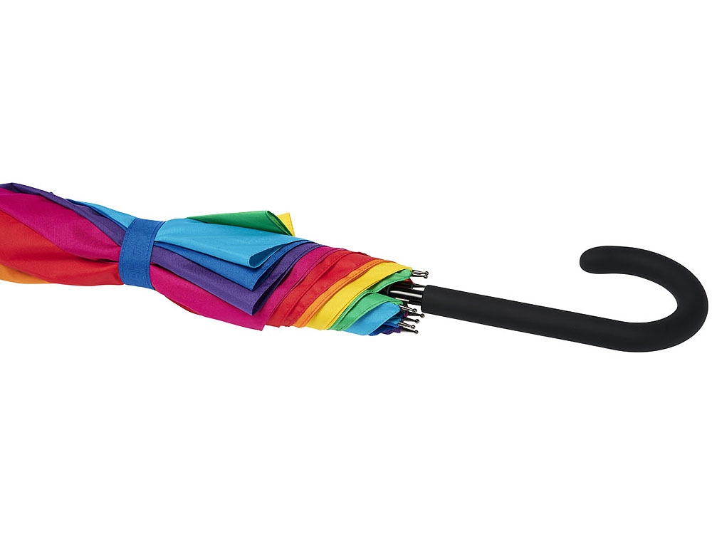 23-дюймовый ветрозащитный полуавтоматический зонт Sarah. Зонт с куполом из эпонж полиэстера, раскрашенный в цвета радуги. Прочный металлический стержень, высококачественная цельная рама из стекловолокна, обеспечивающая максимальную гибкость в ветреную погоду. Выгнутая ручка с мягким матовым покрытием, никелированные верхняя втулка и кончики спиц. Большая область для декорирования на каждой из панелей купола позволяет предложить различные креативные решения для логотипа. Эпонж полиэстер.