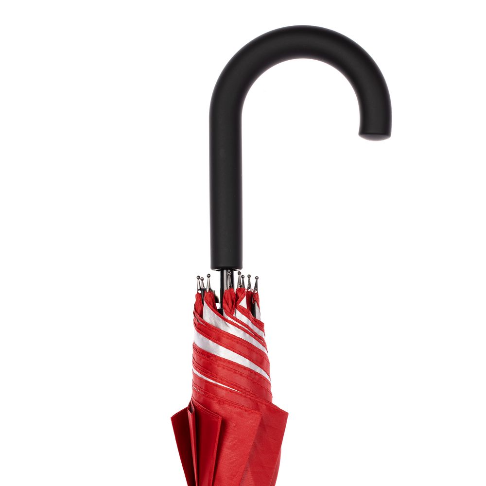 Легкий зонт-трость классической формы, который выглядит нескучно благодаря современным деталям исполнения — серебристому покрытию на внутренней части купола и мягкой прорезиненной ручке.